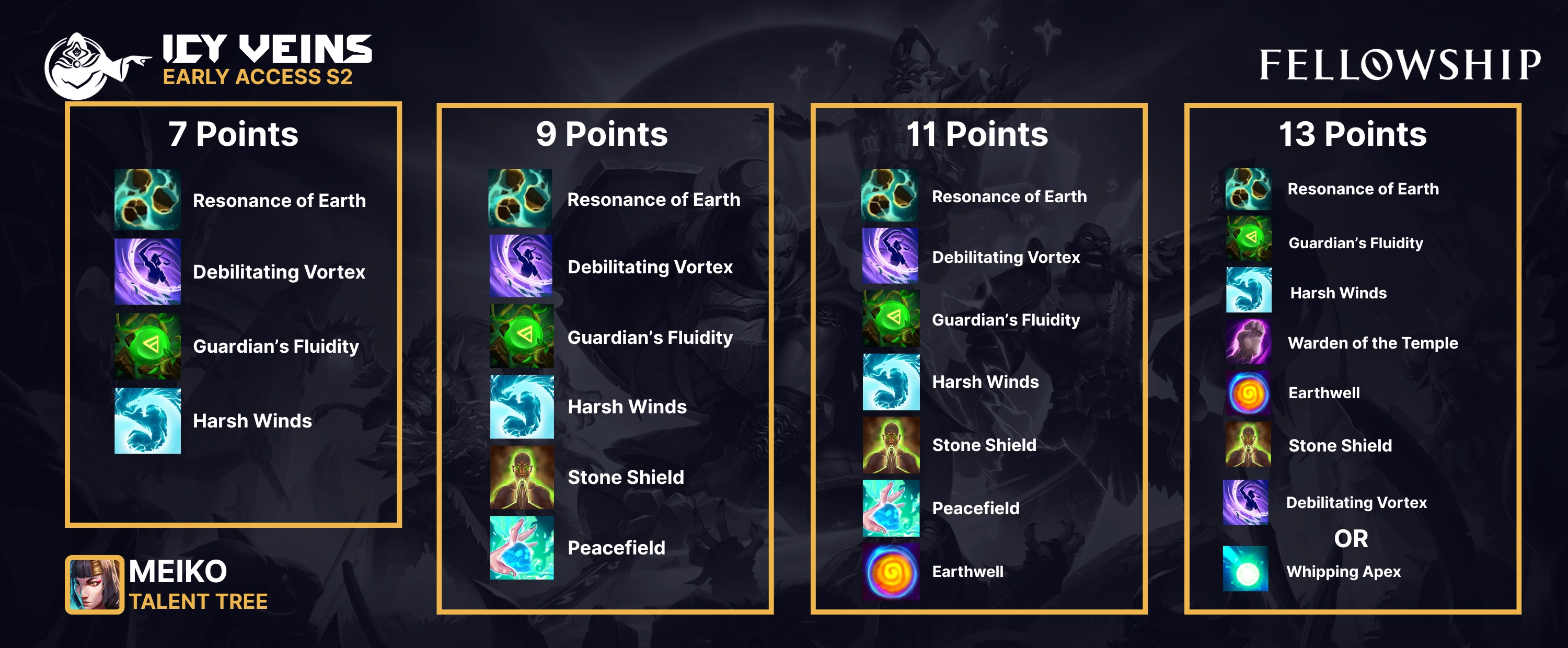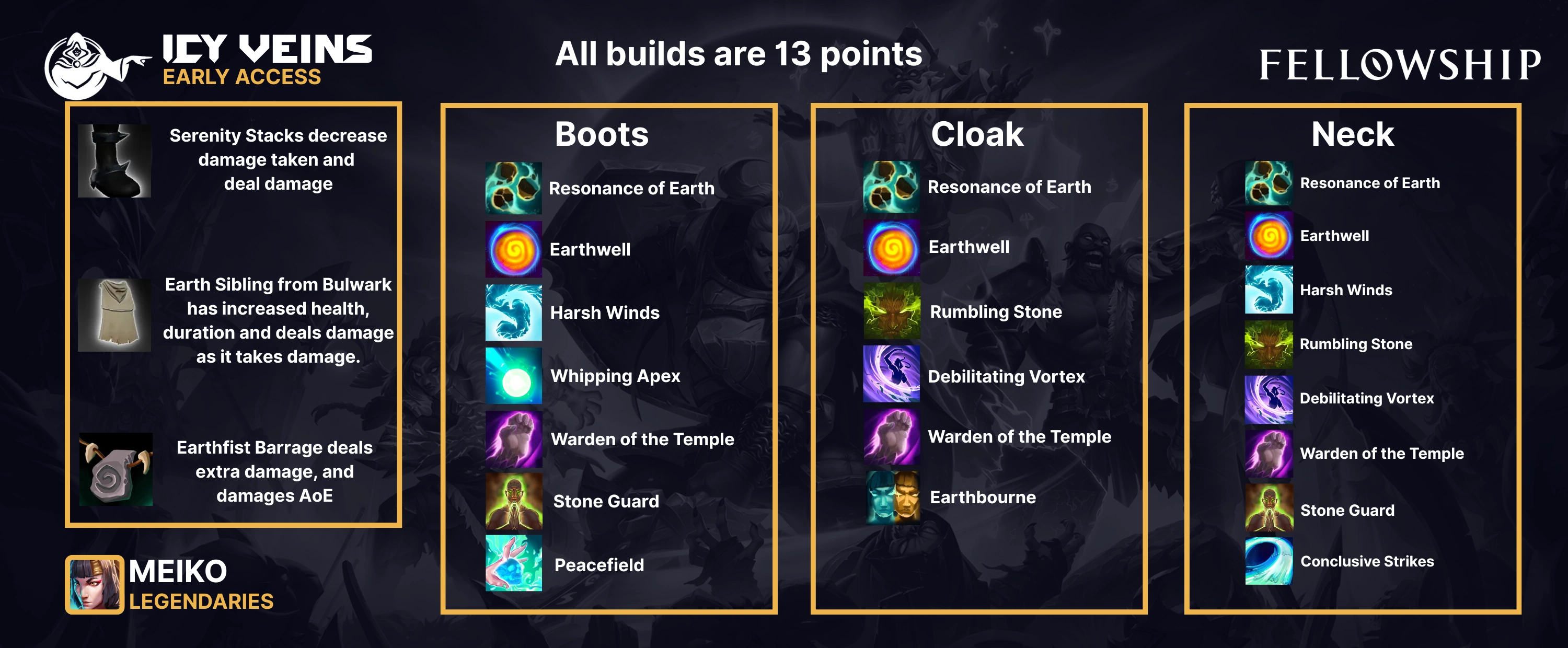 Below is the build we recommend for Meiko that focuses on manually sustaining your buffs for a net benefit through Warden of the Temple, and sustaining your Stone Shields through Serenity and Spirit.