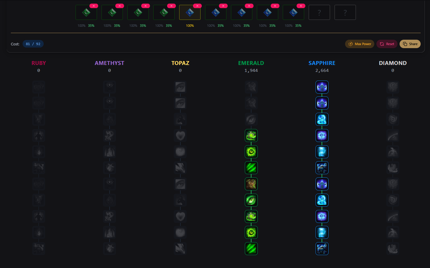 As you start stacking more gems and materials for fusion and re-rolling, you can start building towards best in slot. Assuming full 35% essence sockets + 100% essence from the legendary, you will be able to use either: