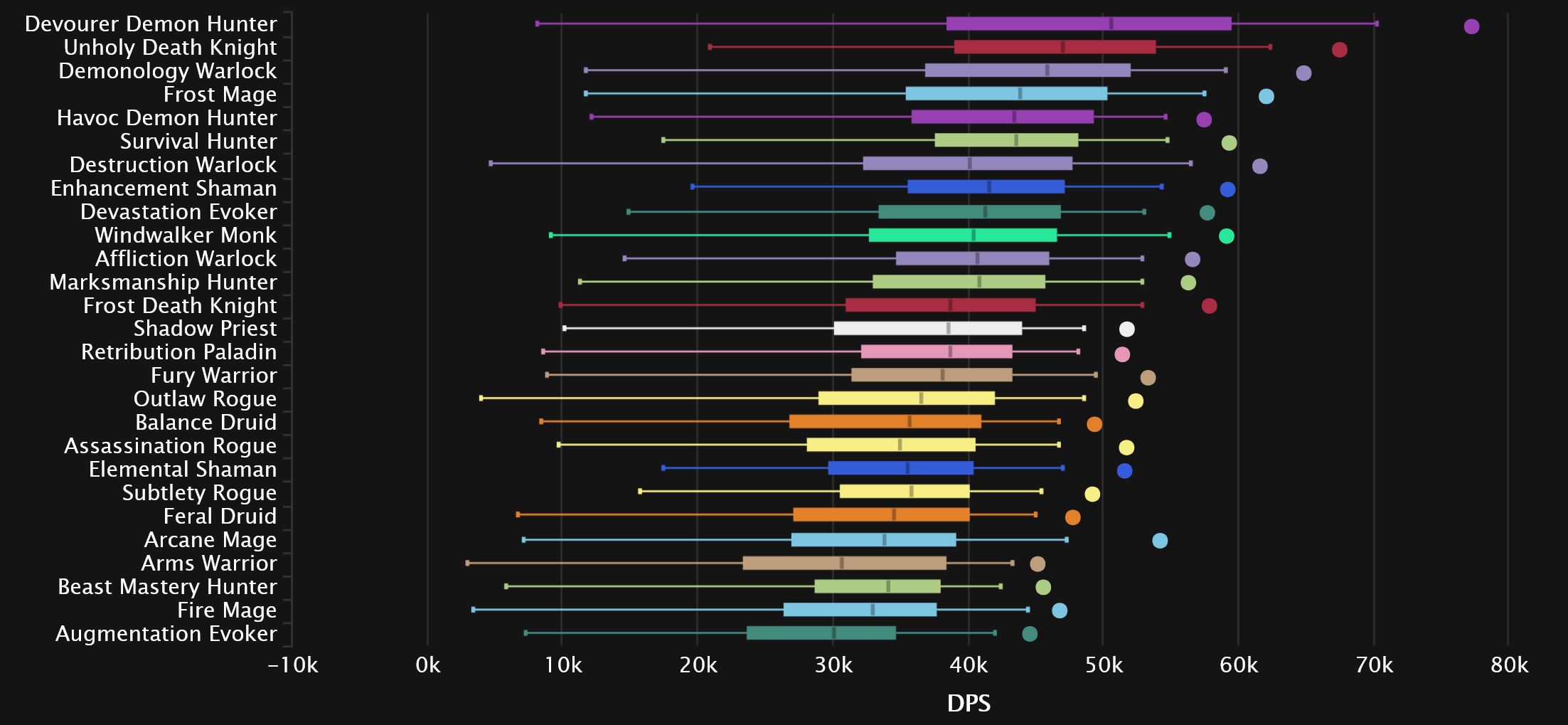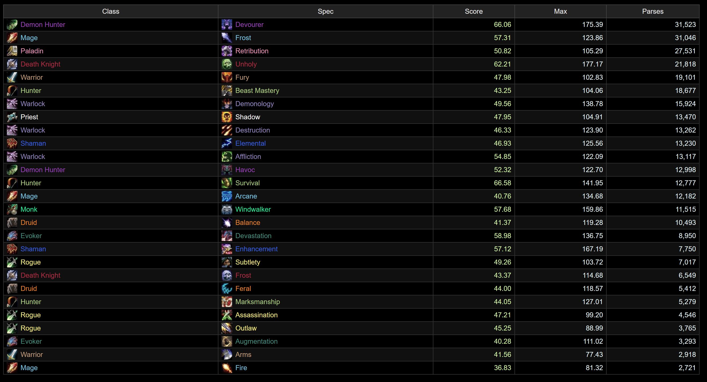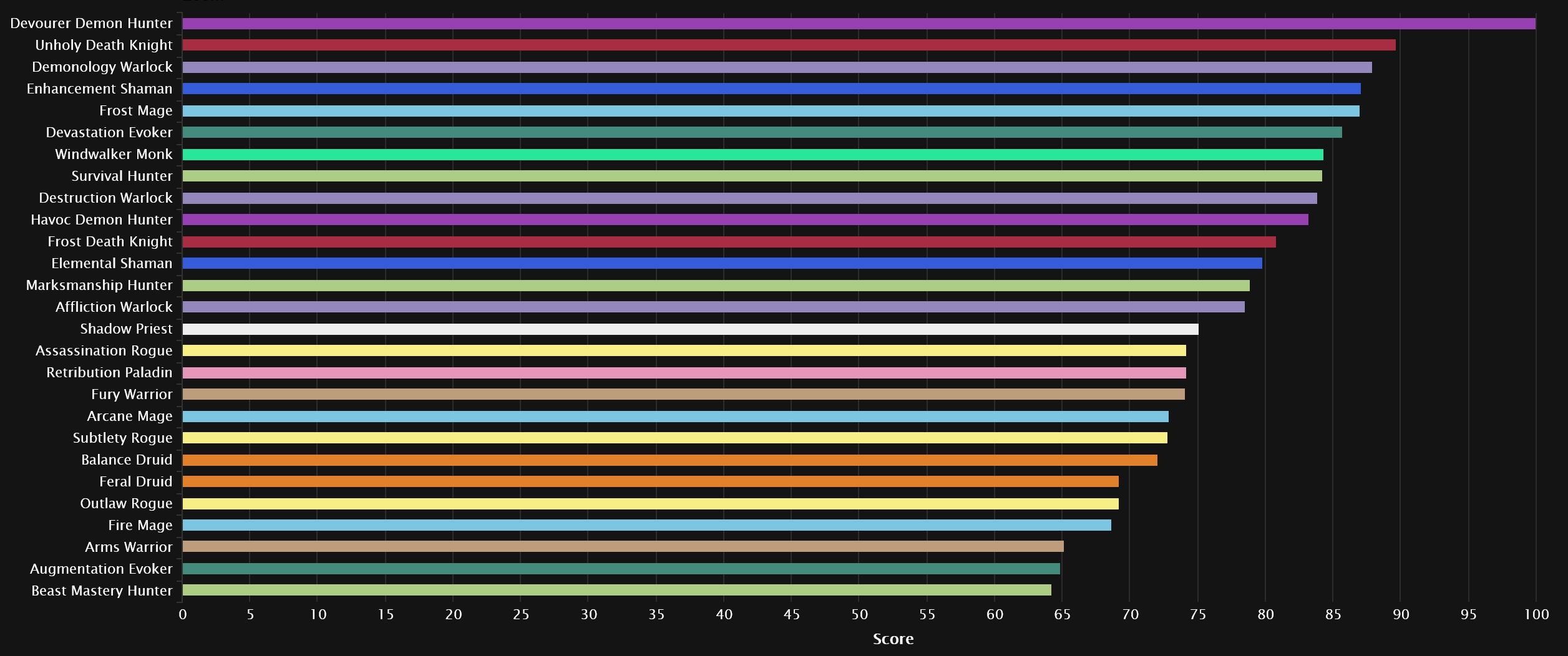 The damage logs themselves show exactly why Devourer has been gaining so many players (aside from simply being the new spec), as its domination extends even further than before. Even after Unholy’s giant 9-spot bounce back into 2nd place, it’s still nowhere close to the Demon Hunter. Demonology also skyrocketed from the bottom of the pack post-tuning, taking Affliction’s place in 3rd, with Destro moving from dead-last into 9th. Enhancement and Frost Mage also see big gains, while Devastation drops 4 spots to 6th, ahead of an also surging Windwalker. Down at the bottom, we see the once No.1 spec of TWW Season 3, as Beast Mastery joins the perpetually penultimate Augmentation, with a sprinkle of Arms seasoning the bottom 3.