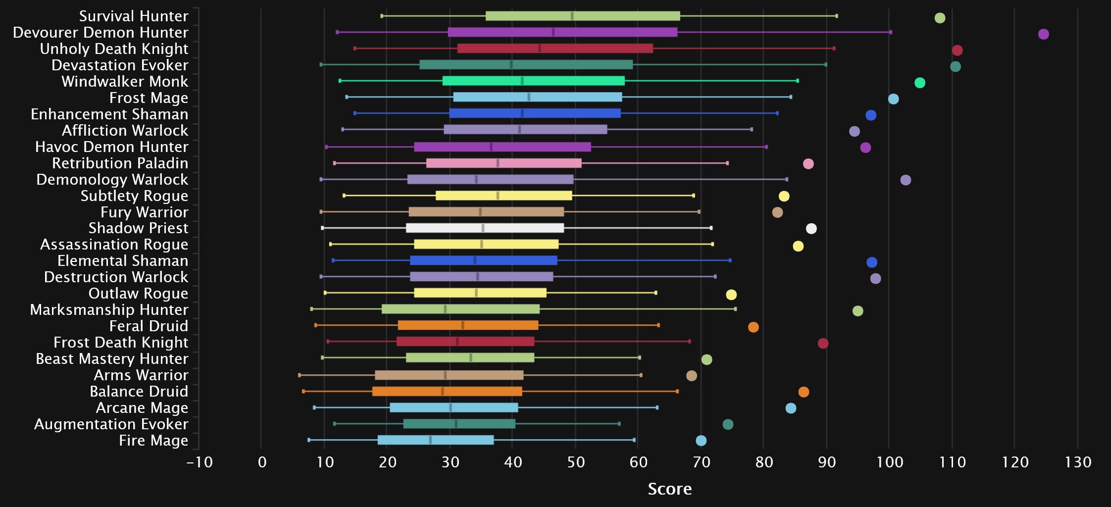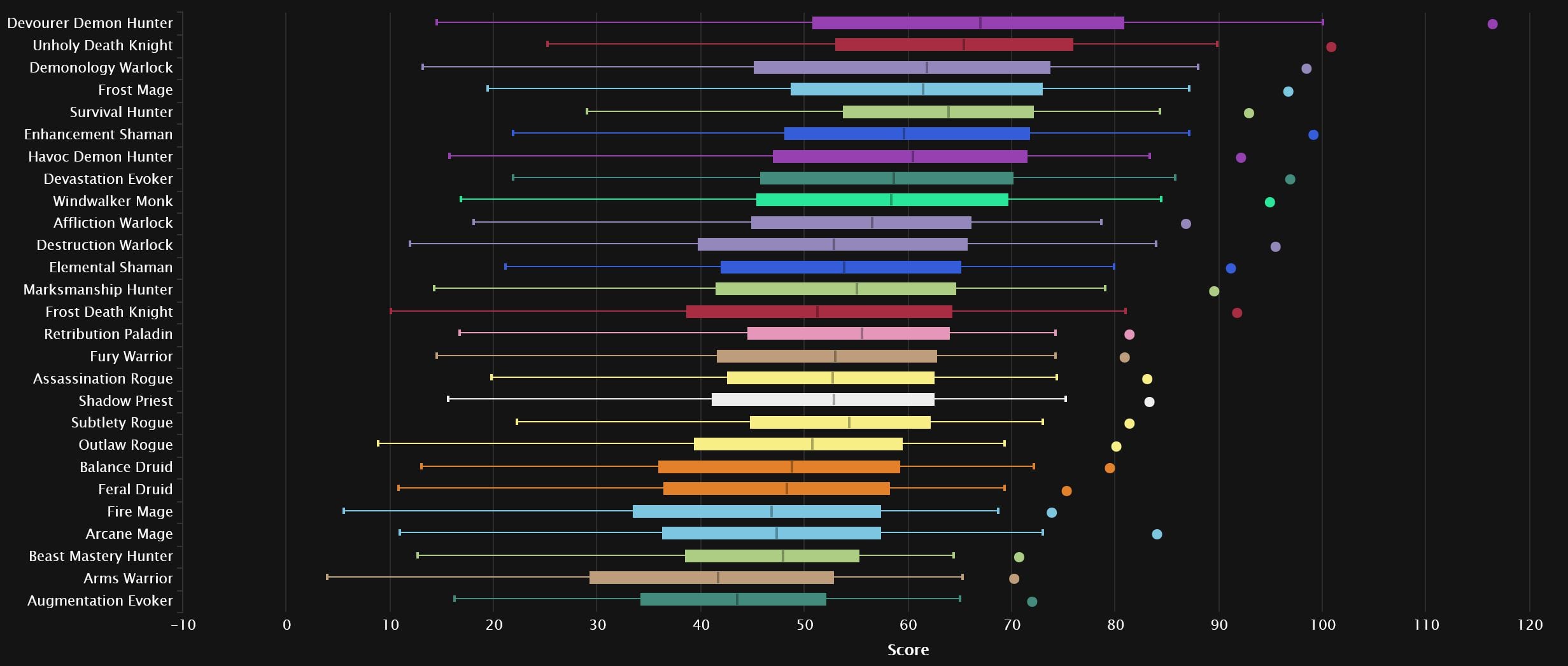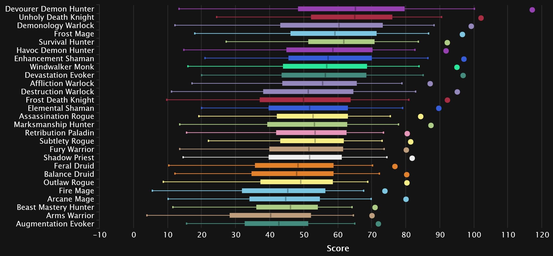 The damage logs themselves show exactly why Devourer has been gaining so many players (aside from simply being the new spec), as its domination extends even further than before. Even after Unholy’s giant 9-spot bounce back into 2nd place, it’s still nowhere close to the Demon Hunter. Demonology also skyrocketed from the bottom of the pack post-tuning, taking Affliction’s place in 3rd, with Destro moving from dead-last into 9th. Enhancement and Frost Mage also see big gains, while Devastation drops 4 spots to 6th, ahead of an also surging Windwalker. Down at the bottom, we see the once No.1 spec of TWW Season 3, as Beast Mastery joins the perpetually penultimate Augmentation, with a sprinkle of Arms seasoning the bottom 3.