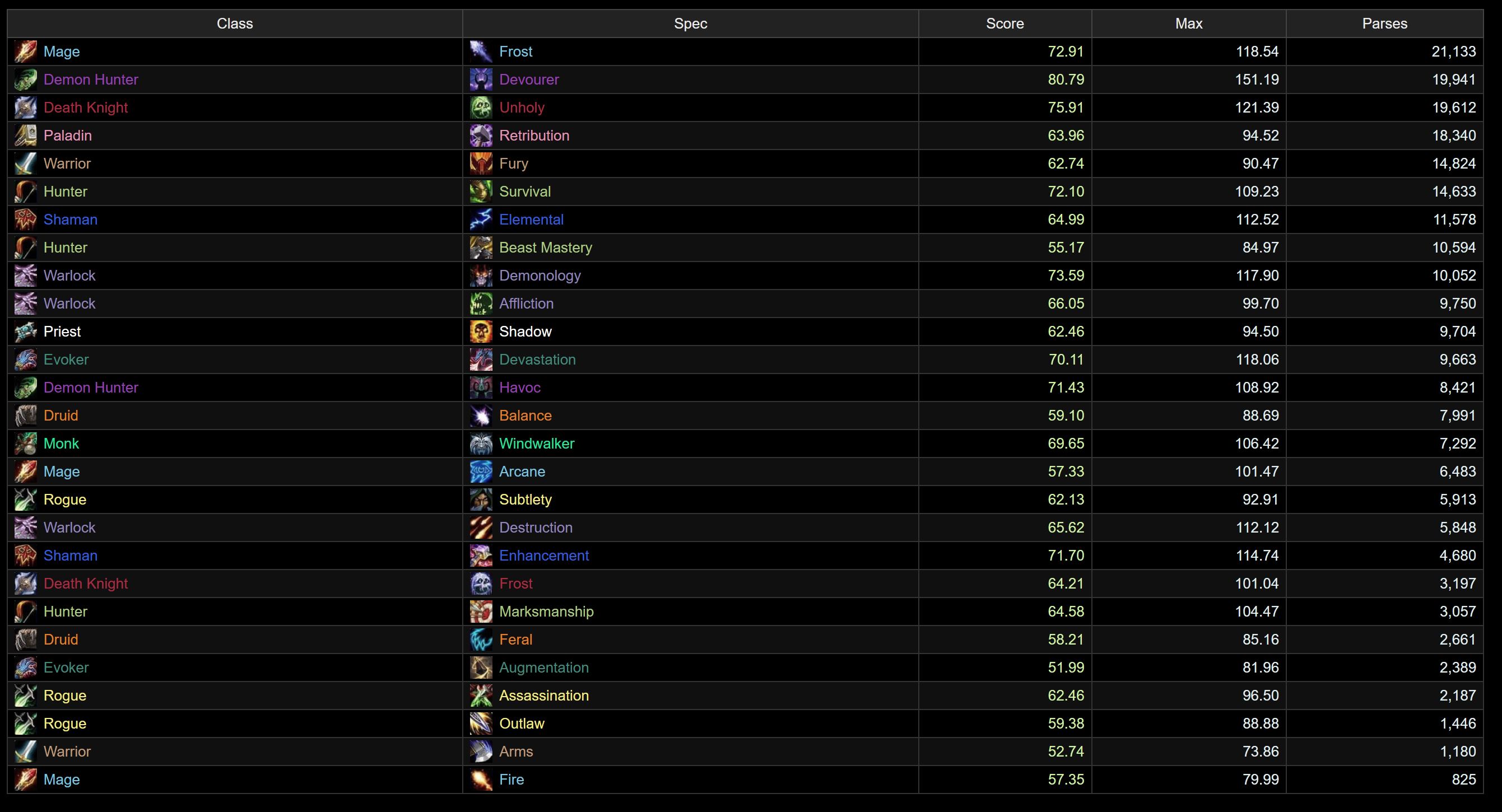 The generalist chart is very similar to the top parses, but we do see Frost Mage and Survival doing a little better, both edging out Enhancement. Havoc is also improved here, sitting in 7th. Affliction didn’t drop quite as far down, managing to hang on to the top 10, but just barely.