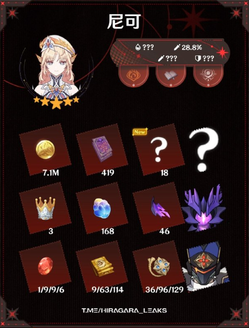 Hiragara Leaks created the infographic below depicting the materials needed to level Nicole fully.