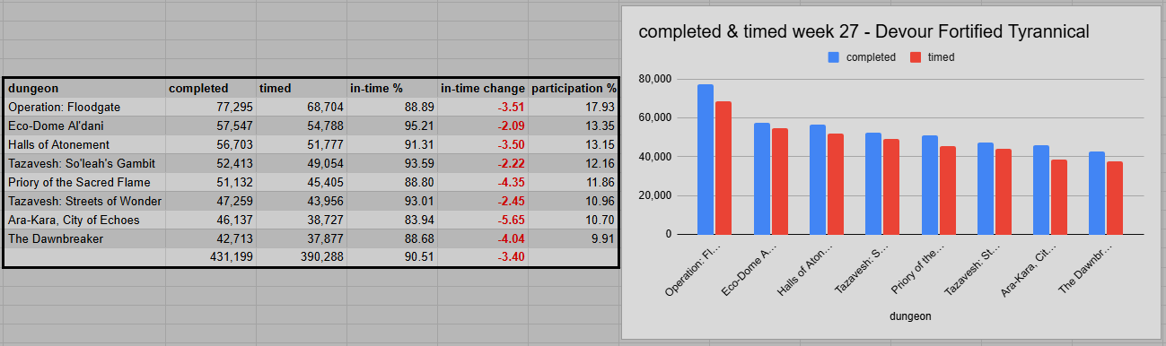 The major decrease in the success rate is rather odd, given that Devour is an easy affix. But a look into the key level split will reveal more later on. On average, the drop was 3.4 percentage points, down from 93.91% to 90.51%. Eco-Dome (95.21%) stayed on top, ahead of Gambit (93.59%) and Streets (93.01%). The only three dungeons that dropped less than the average. Halls (91.31%) remained in its usual fourth