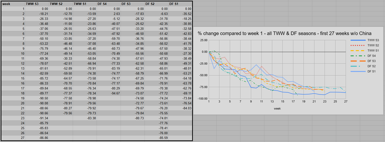 A decline of 12.50% is usually found in a mid-season week. The regular four regions only saw a drop-off of 5.86%. Meanwhile, the activity on the Chinese servers plummeted by 26.58%. The 4 post-season weeks have been incredibly stable so far. And early numbers for week 5 confirm this trend. Looking at DF S4, which had a similar situation of Remix mode leading into a pre-patch, numbers back then were less stable. But the major nosedive during the overlap with early access will definitely repeat shortly after the last reset.