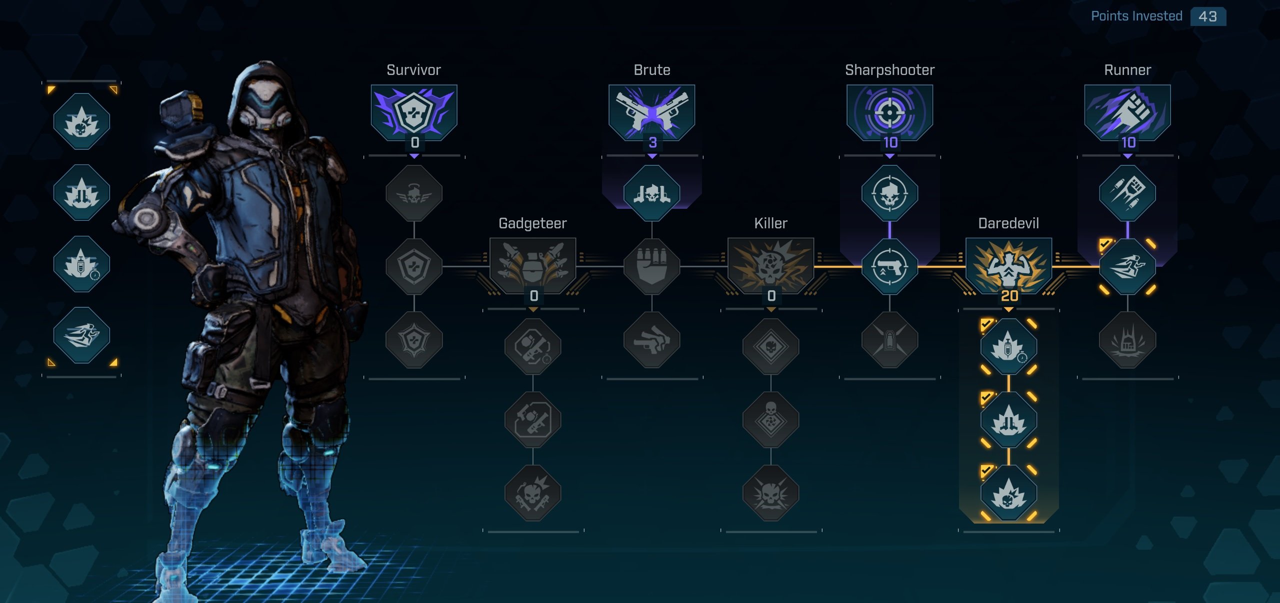 To spend your point efficiently you should invest into the Sharpshooter and Runner trees to unlock the Daredevil tree and then invest a further 20 points to unlock all Daredevil passives. Any remaining points can be invested into Brute and Killer for Gun Damage and Critical Hit Damage respectively.