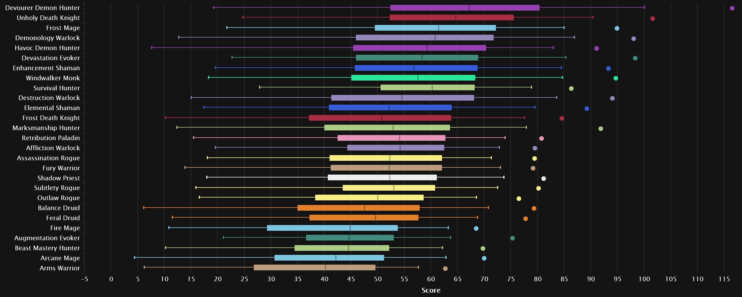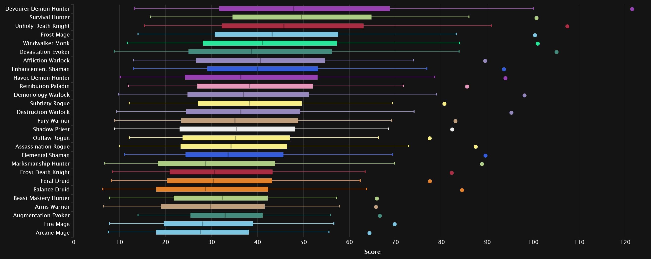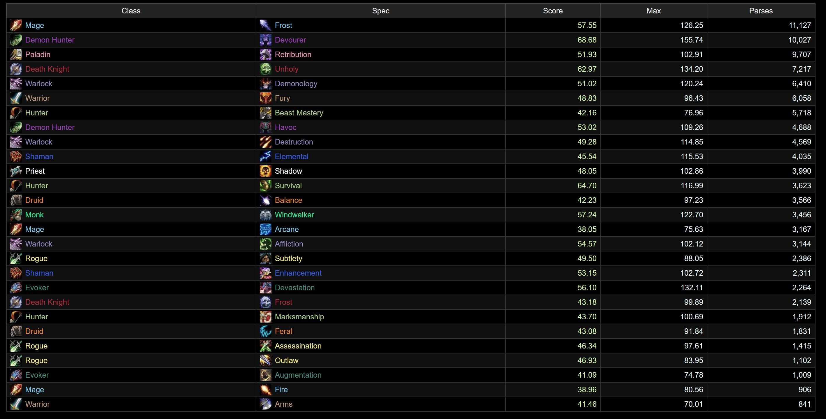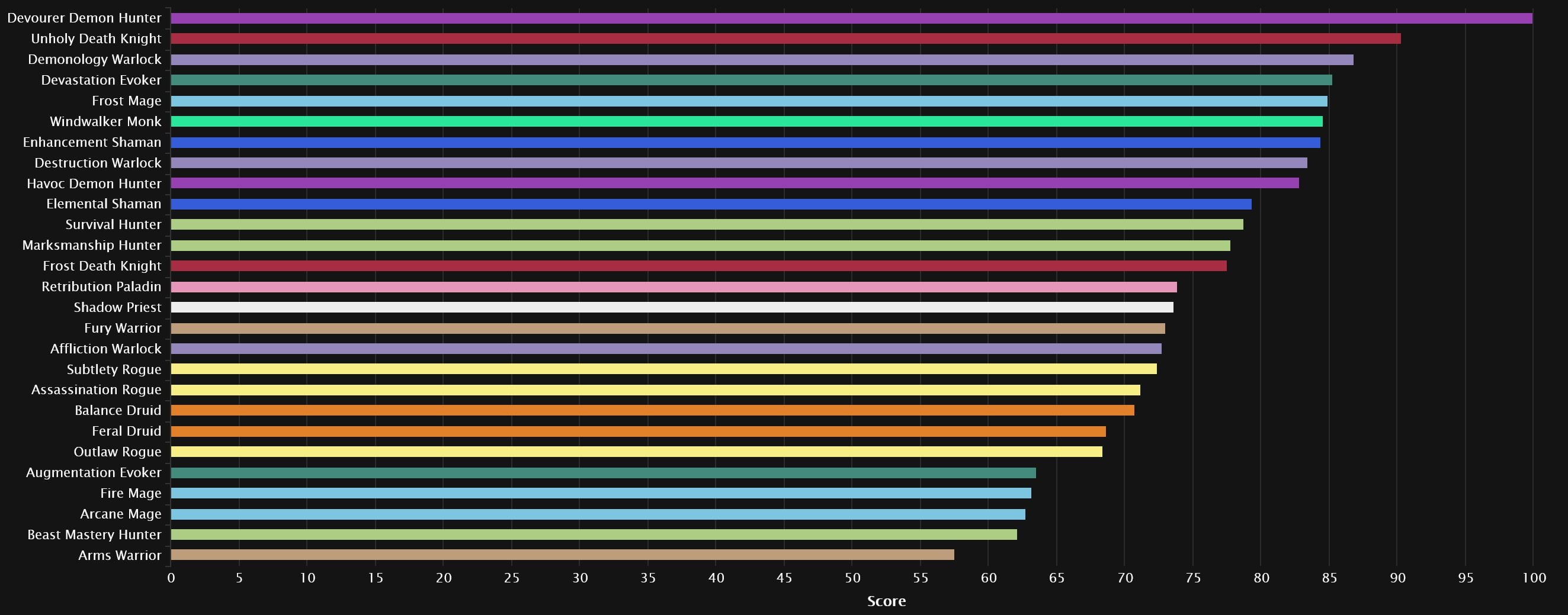 The top 3 remain the same as last week, with Devourer pulling a little further ahead. Devastation is the first one pushing up, as it gains two spots in 4th. Despite its popularity, Frost Mage remains stable in 5th, while we see Windwalker gain a spot right after. Enhancement and Destruction meet, with the Shaman dropping 3 spots and the Warlock rising one. Survival drops out of the top 10 altogether, hanging in right behind Elemental, which grabs the final spot. Arcane joins Arms and BM at the very bottom, as Augmentation moves a few spots up.