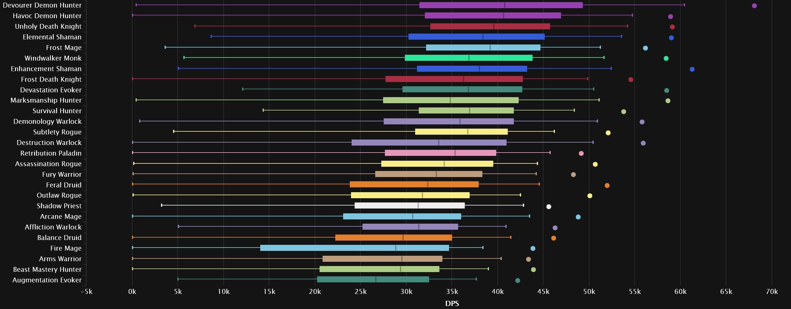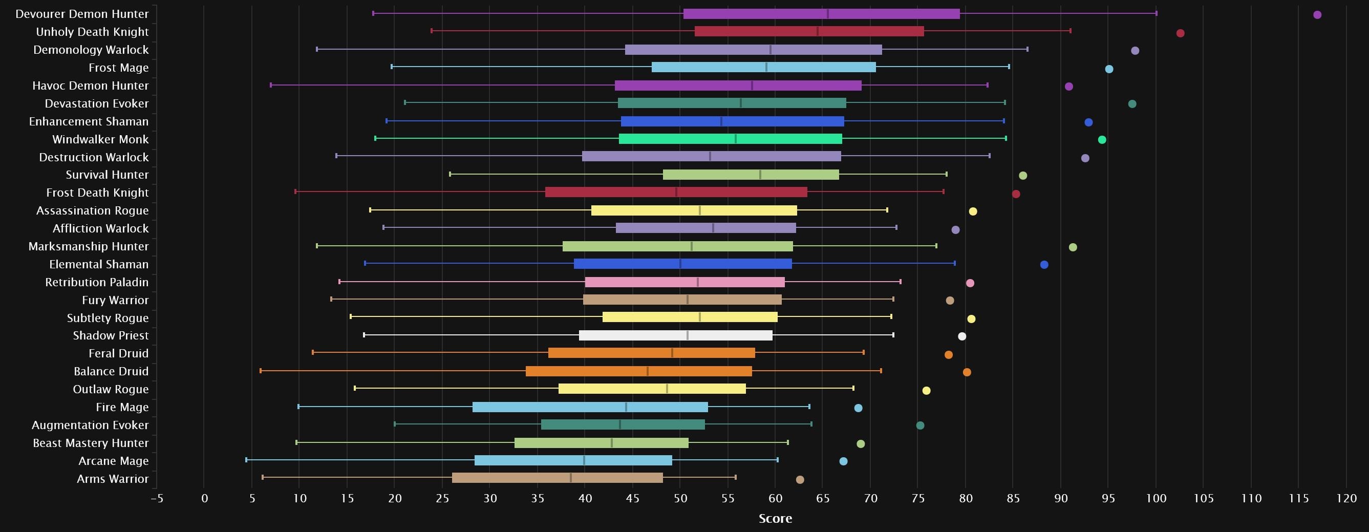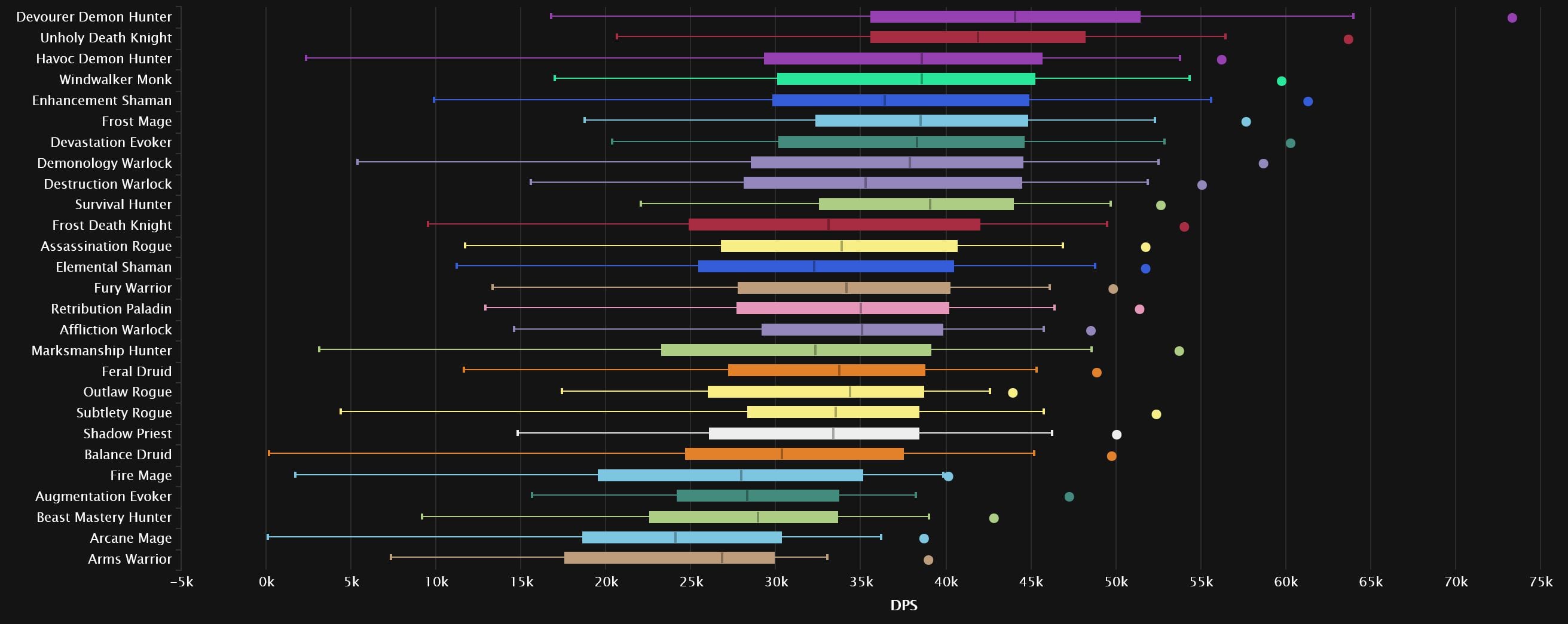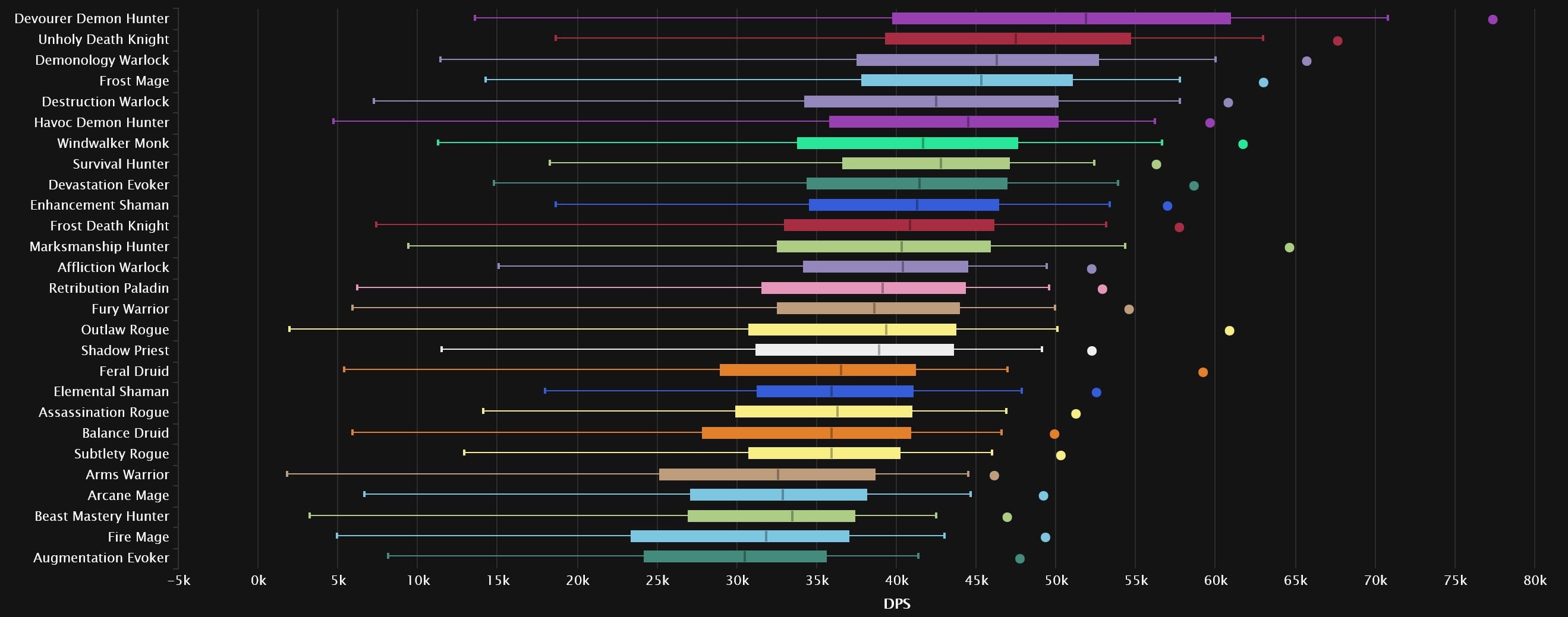 The top 3 remain the same as last week, with Devourer pulling a little further ahead. Devastation is the first one pushing up, as it gains two spots in 4th. Despite its popularity, Frost Mage remains stable in 5th, while we see Windwalker gain a spot right after. Enhancement and Destruction meet, with the Shaman dropping 3 spots and the Warlock rising one. Survival drops out of the top 10 altogether, hanging in right behind Elemental, which grabs the final spot. Arcane joins Arms and BM at the very bottom, as Augmentation moves a few spots up.
