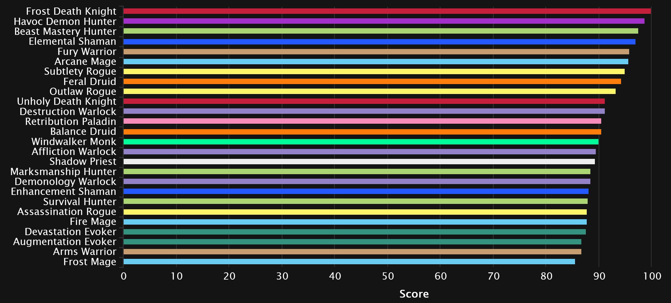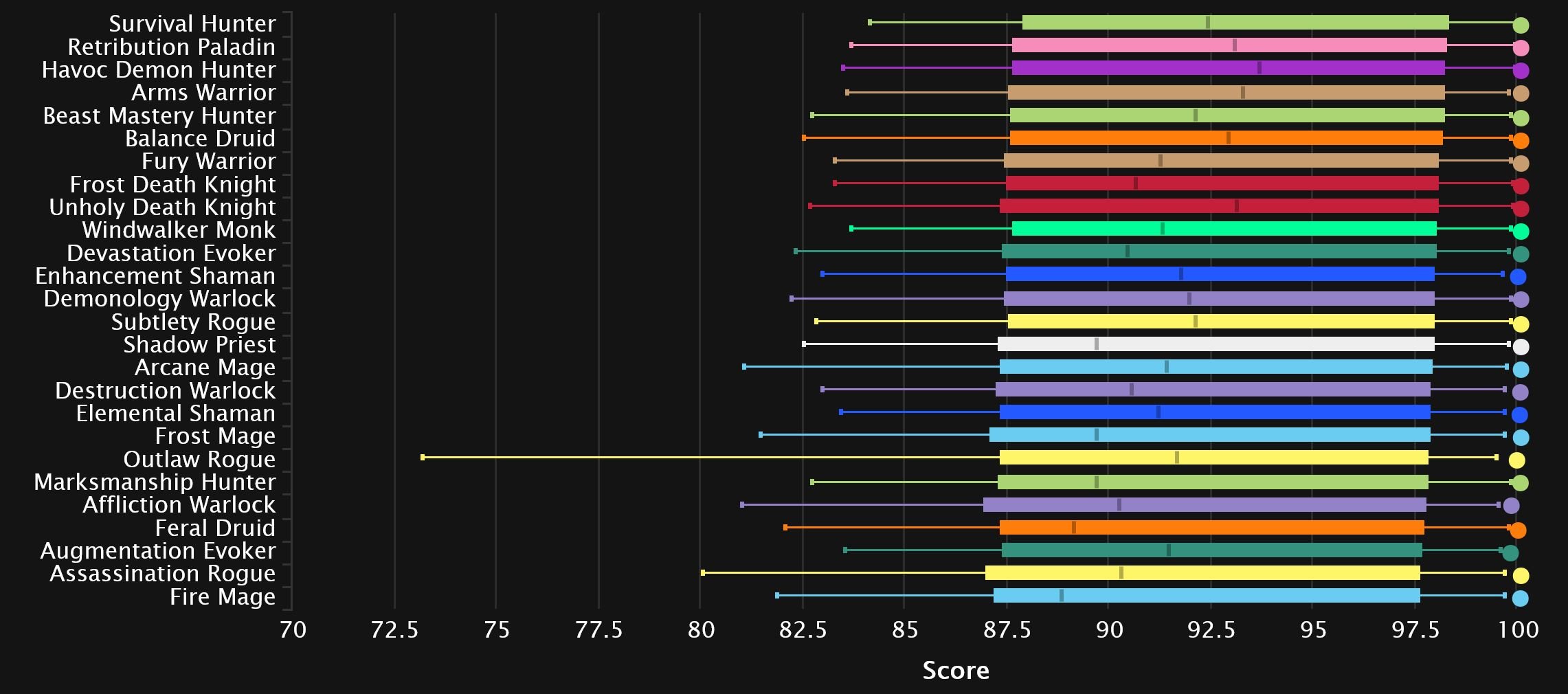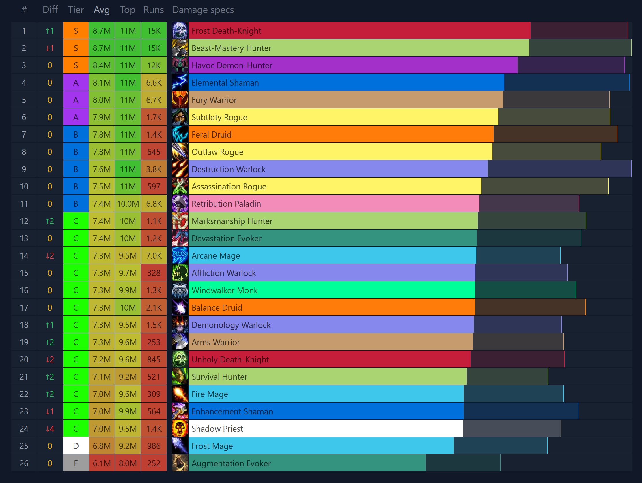 Arcane is falling in the top percentiles, as players may still be adjusting to its nerfs from a few weeks ago. The Mage drops two spots into 6th as Elemental and Fury both move past it, while the rest of the top 10 remains exactly the same! Just outside it, however, we see Destruction move up two spots and replace Retribution in 11th. Down at the bottom of the list we see Assassination make it out, while the Evokers group up, and Aug enters the final three spots.
