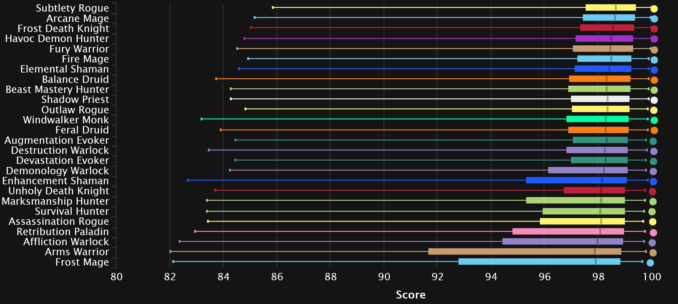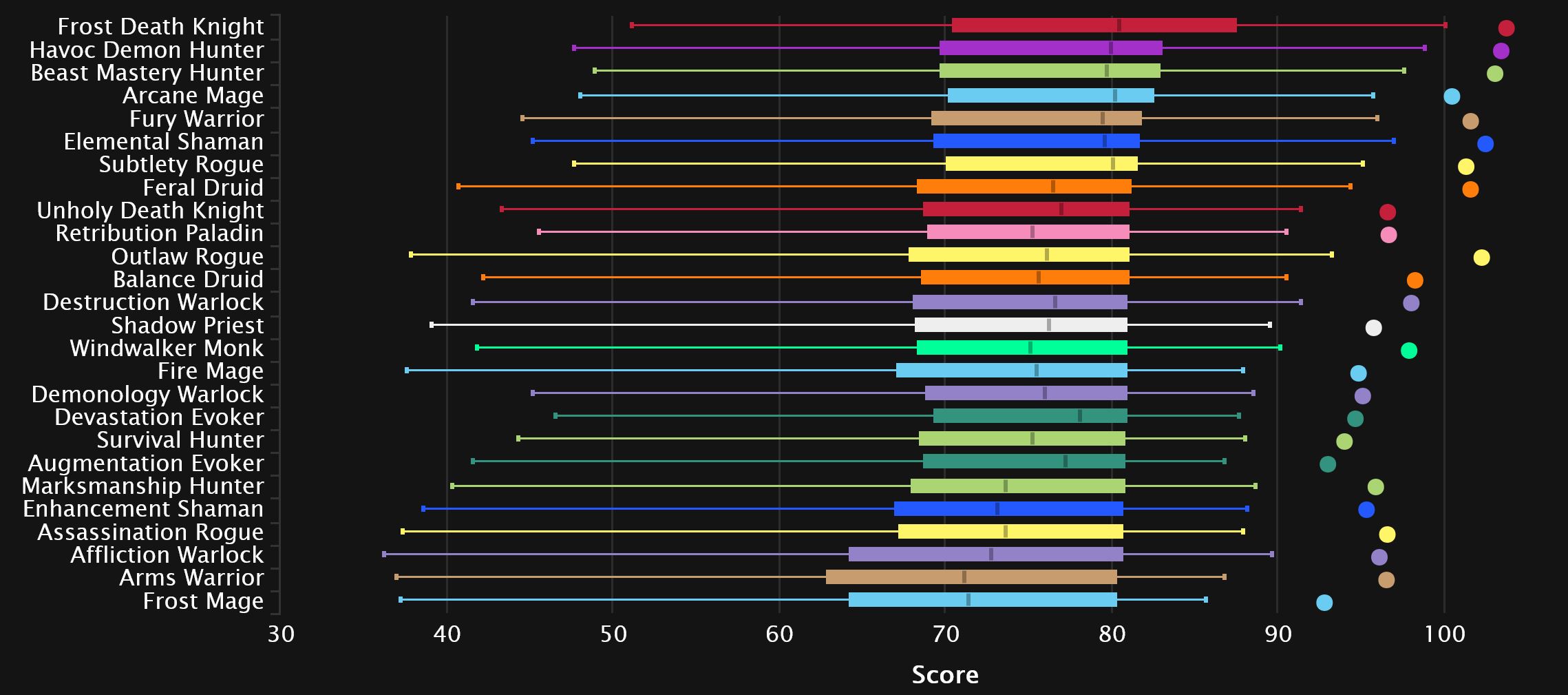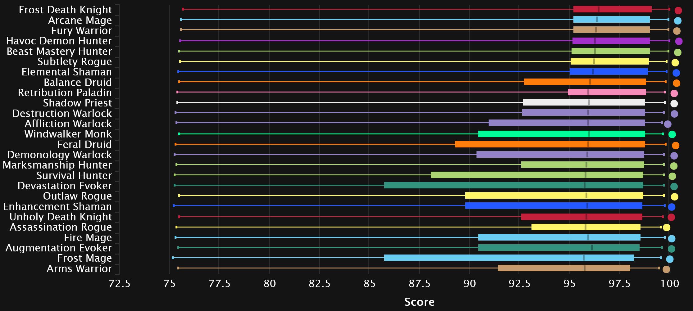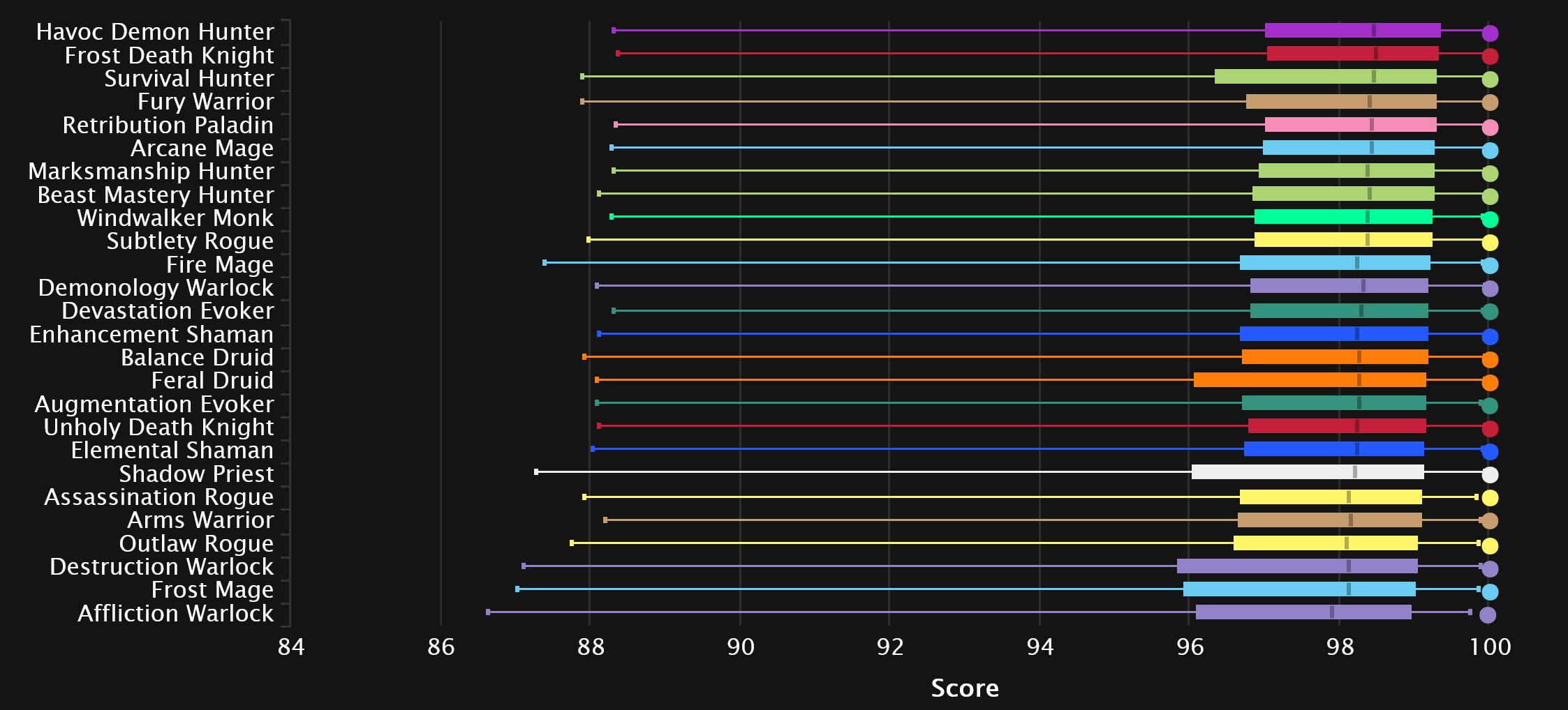 Arcane is falling in the top percentiles, as players may still be adjusting to its nerfs from a few weeks ago. The Mage drops two spots into 6th as Elemental and Fury both move past it, while the rest of the top 10 remains exactly the same! Just outside it, however, we see Destruction move up two spots and replace Retribution in 11th. Down at the bottom of the list we see Assassination make it out, while the Evokers group up, and Aug enters the final three spots.