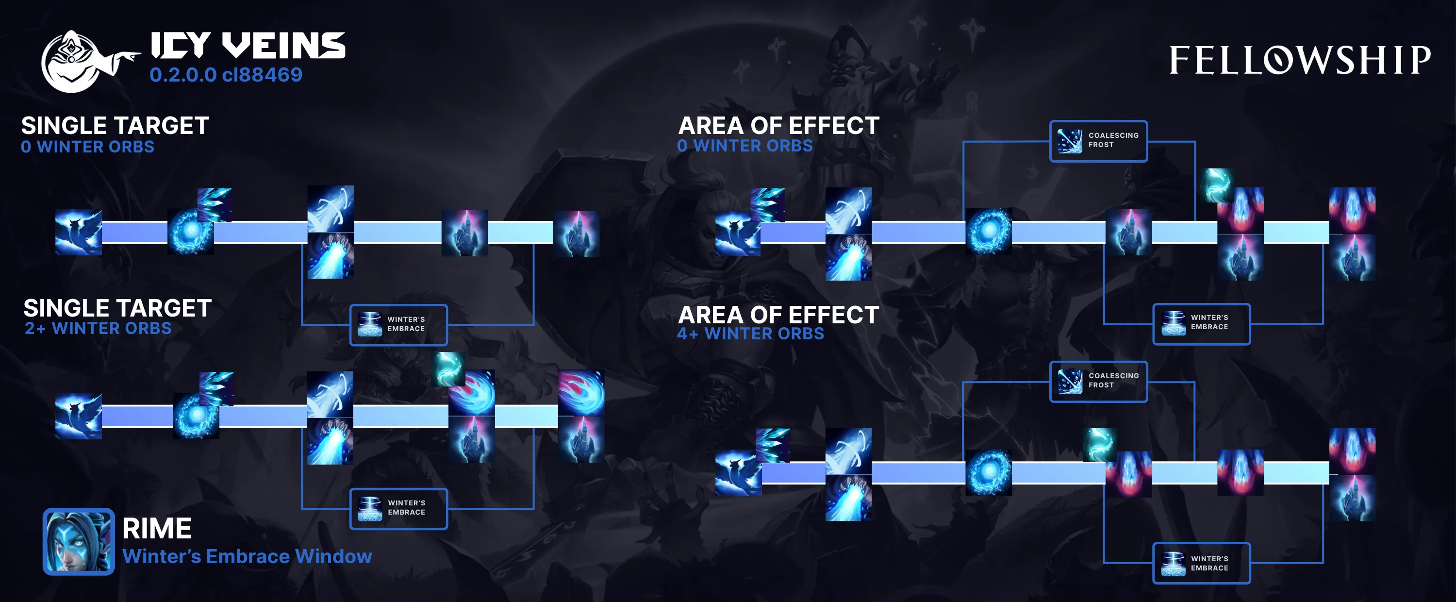 Winter’s Embrace lasts 3 seconds which allows for a full channel of Freezing Torrent, or several casts of Ice Comet and Cold Snap. You’ll want to go into each window with the enough Winter Orb’s to cast your spenders without overcapping from the Freezing Torrent and Bursting Ice generation.