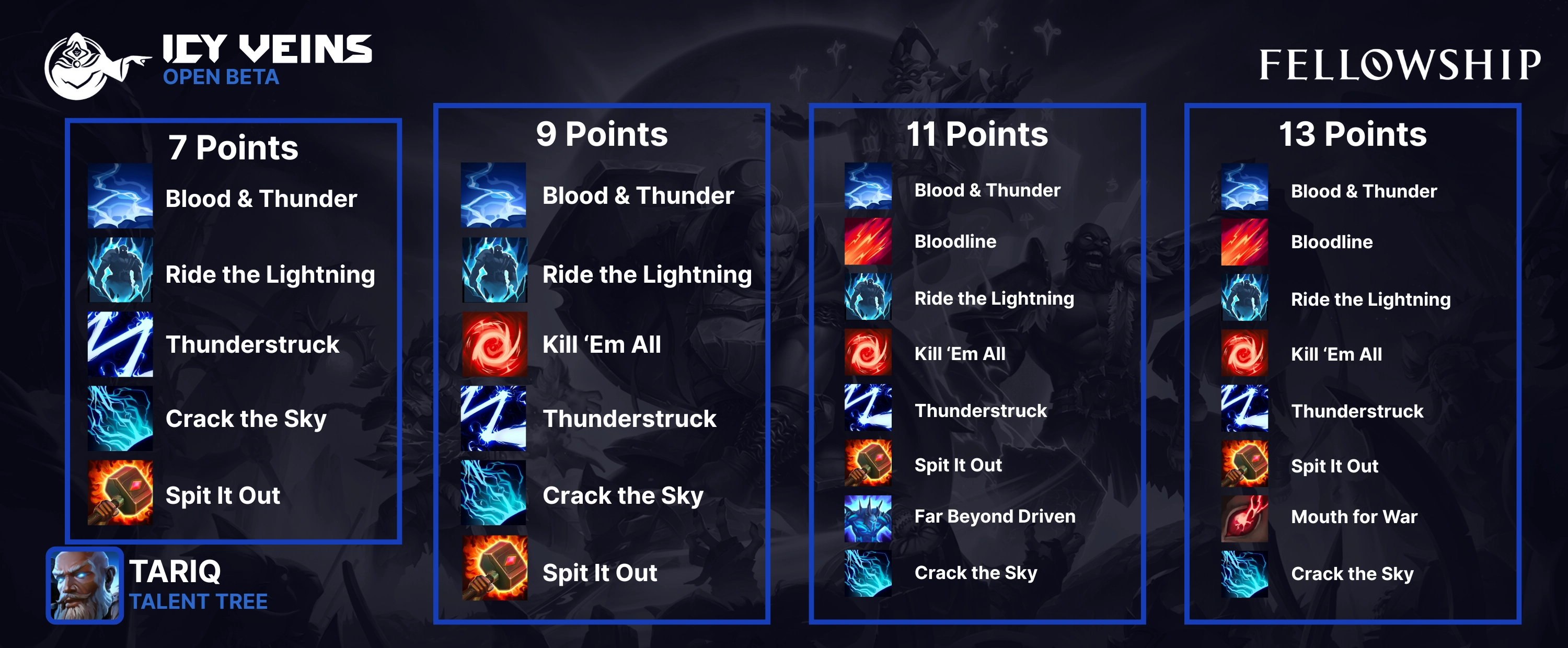 Tariq has a few builds that he can utilize, but this guide will focus on his most consistent and well-rounded talent build: Lightning Build. This guide will refer to the talents by their name and the row/column that they are located in.