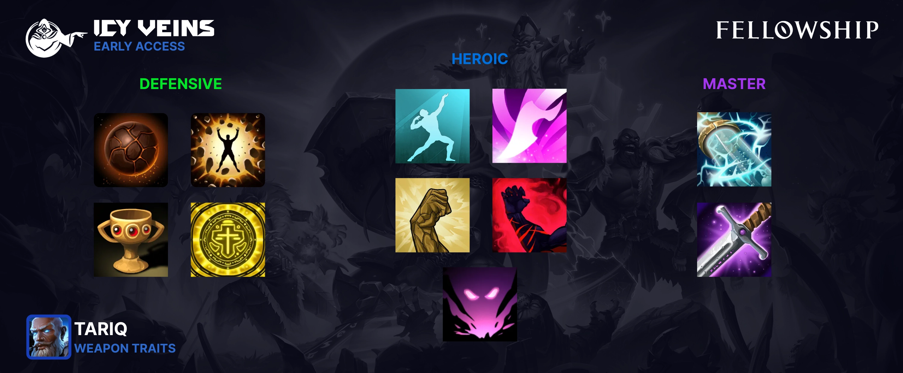 ![]() | Inspired Allegiance | When this trait procs, it increases the Haste rating for youself and your allies. The main attraction is that it also decreases your weapon’s ability cooldown. Due to the nature of Tariq and how we want as much uptime for our abilities, this weapon trait is arguably our BiS option for Fateful Basher. |