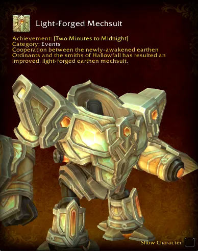 The Light-Forged Mechsuit iconLight-Forged Mechsuit is one of the new mounts coming in the Pre-Patch event, and it is only obtained by heavily partaking in the event.