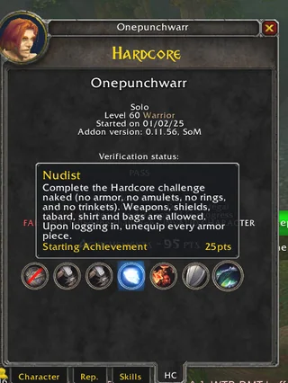 Hardcore WoW has often been associated with self-imposed rules, with players choosing to add additional challenges beyond simply not dying. Some of these challenges prevent players from using talents, completing quests, trading, grouping with others (later added to official servers as the Self-Found mode), and some challenges even restrict the use of gear.