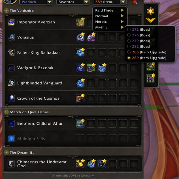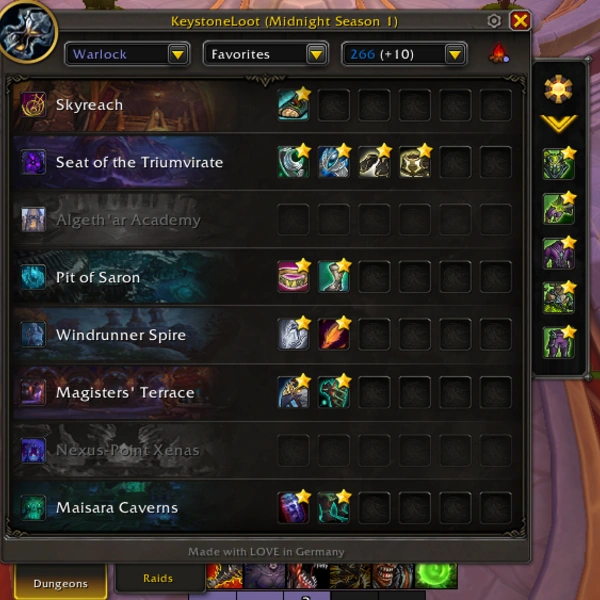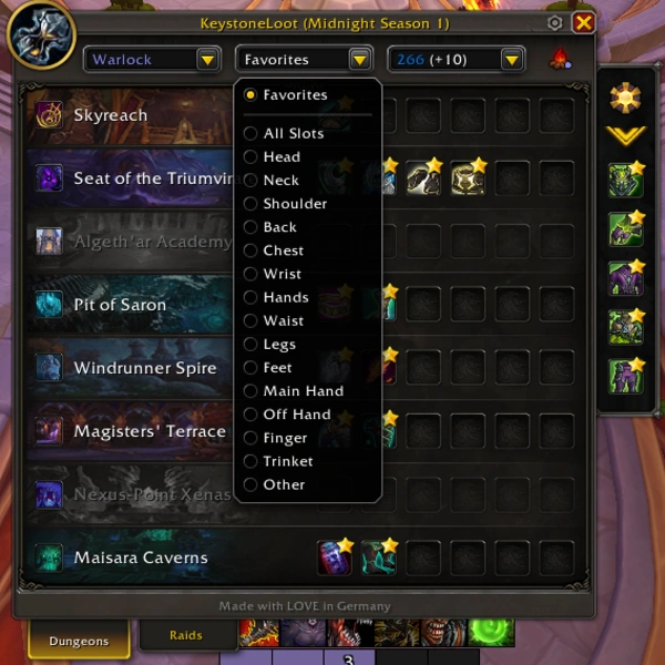 Players select their spec from the top left dropdown menu. This lets the addon filter gear available to them from both dungeons and raid bosses. From there, players are able to click gear they wish to favorite.