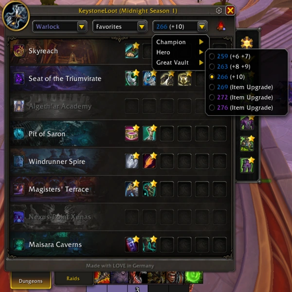 For example, if you’re farming for heroic gear, the add-on tells you that 259 gear drops from +6 and +7, 263 from +8 and +9, and 266 from +10.