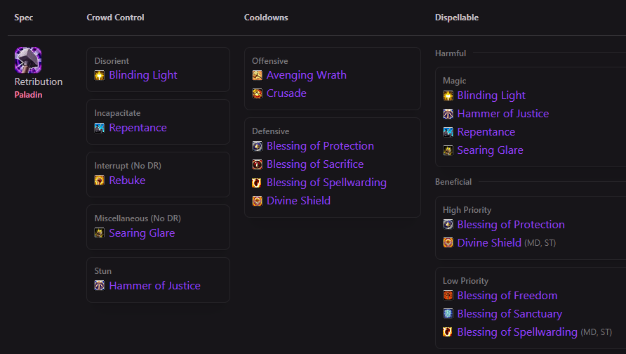 Dreamwalk’s Spell Table is a sleek, beginner-friendly tool designed to make PvP a little less over-facing. It’s no secret that with WoW’s ever-expanding list of classes, specs, and spells, it’s a challenge to keep track of every opponent’s toolkit. But now, whether you’re learning a new class or scouting an enemy, Dreamwalk’s Spell Table filters out the noise, showing you only the important spells you need to understand for competitive PvP.