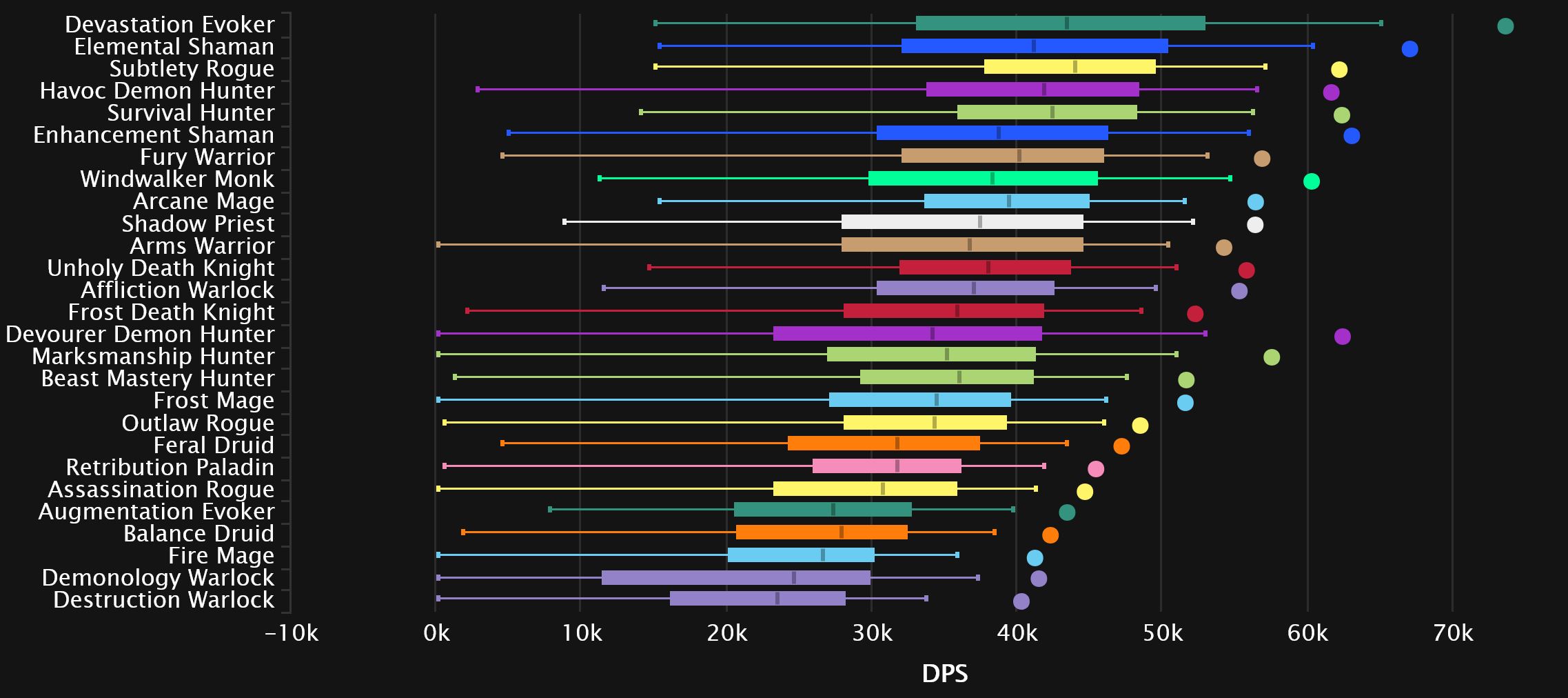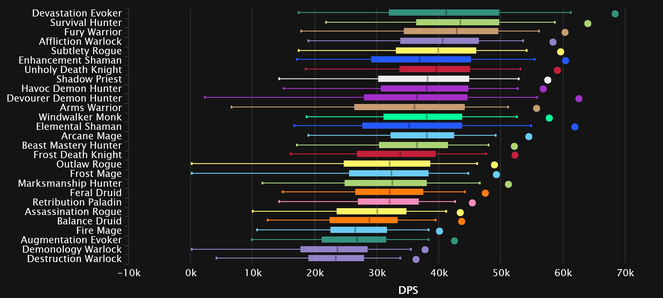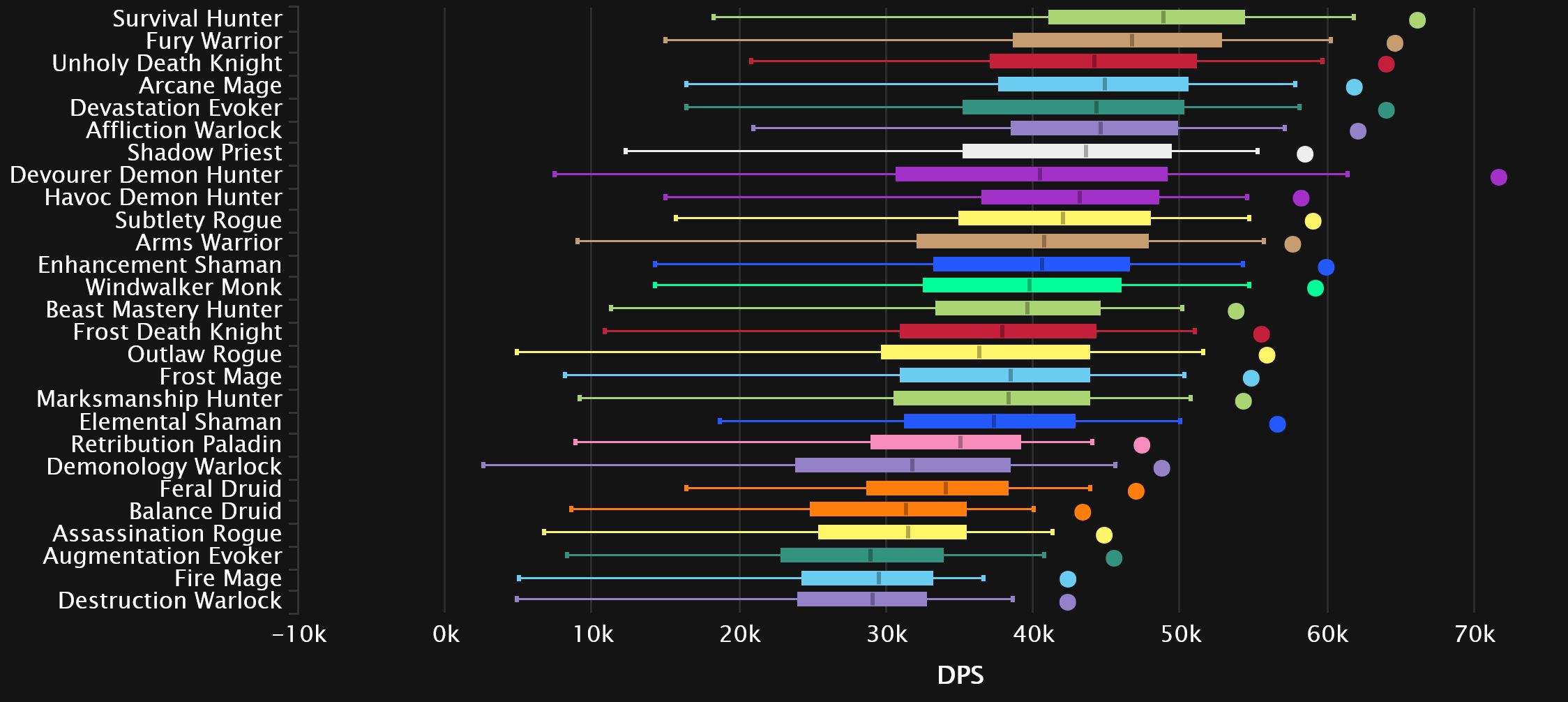 Week two of the pre-patch is almost behind us, and we have some clean logs to look at! The item level shenanigans from the first week have cleared out, and the class tuning has taken effect. Unholy is down to where it probably should be, and Devourer is moving on up, with Devastation and Survival duking it out for the top spot.
