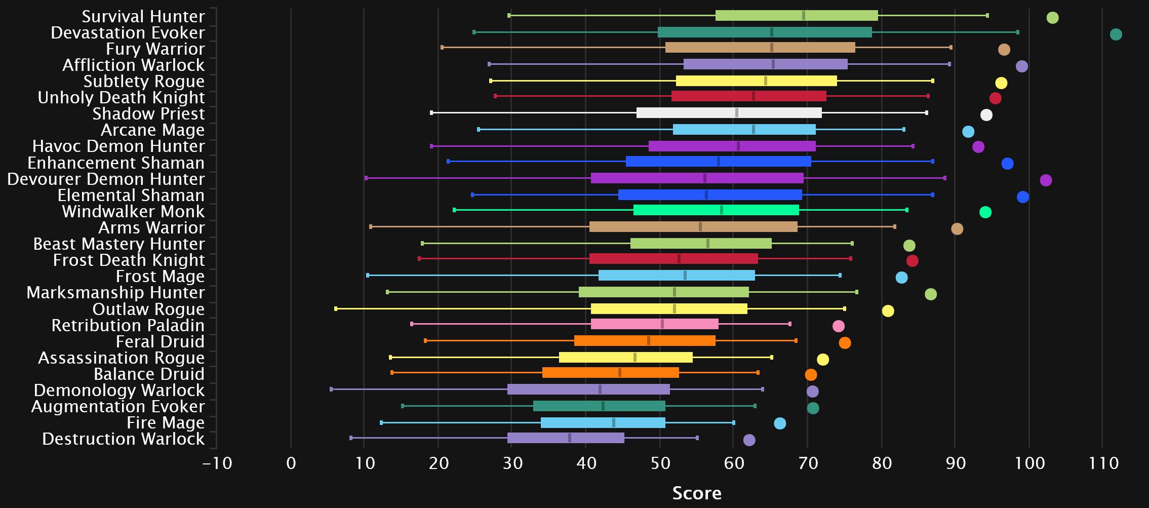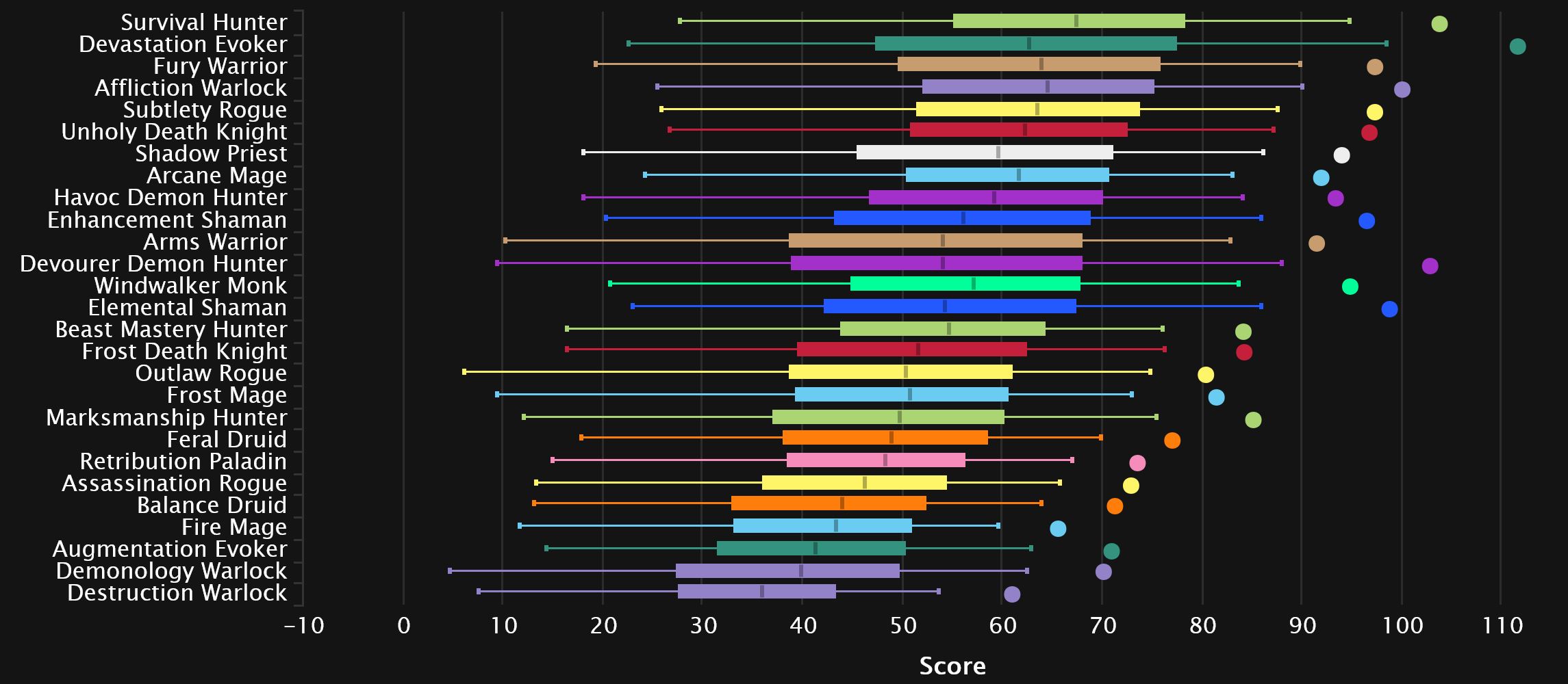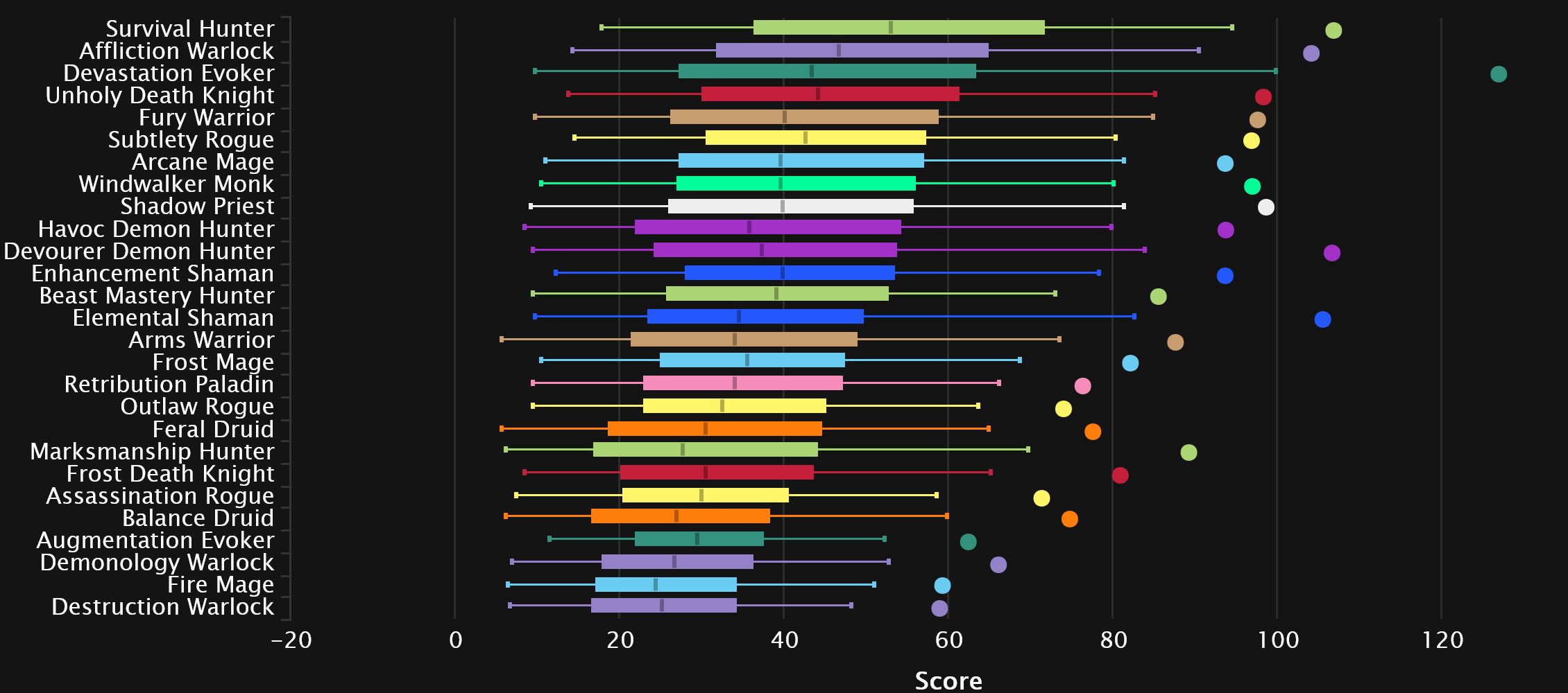 Week two of the pre-patch is almost behind us, and we have some clean logs to look at! The item level shenanigans from the first week have cleared out, and the class tuning has taken effect. Unholy is down to where it probably should be, and Devourer is moving on up, with Devastation and Survival duking it out for the top spot.