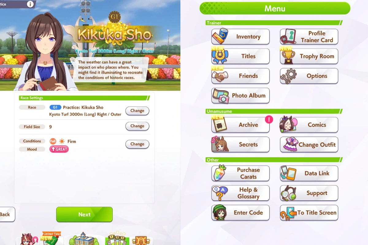 If you’re looking to try out your Umas, you can go to the practice runs or the room matches and try out the settings on the Kikuka Sho track to check if your characters are performing up to your expectations.
