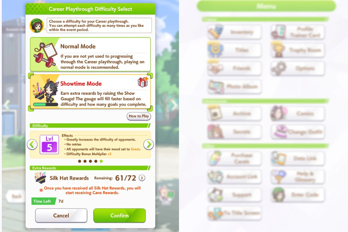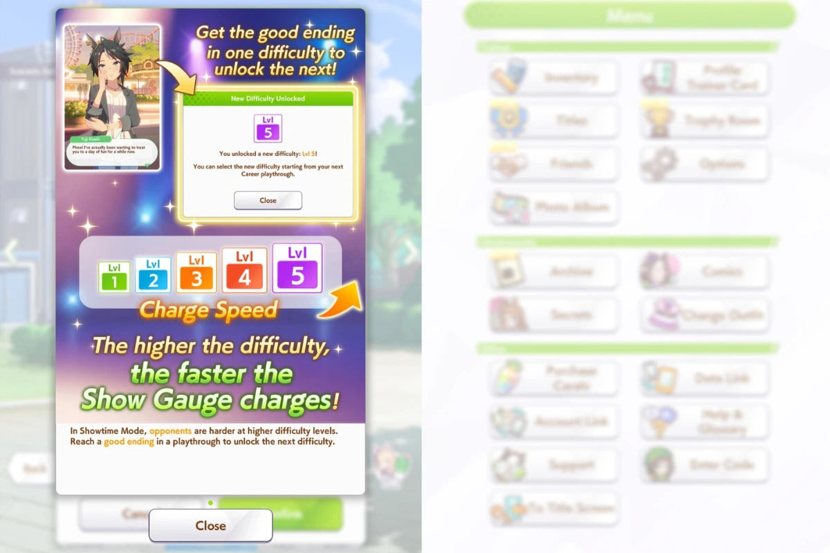 Right after you’ve selected your Uma and are about to start a Career run, the game will give you a pop-up, asking you if you want to play the Normal mode or the Showtime Mode. There are also five difficulty levels for the Showtime Mode. You must achieve the good ending with any Umamusume at each difficulty level to unlock the next one.