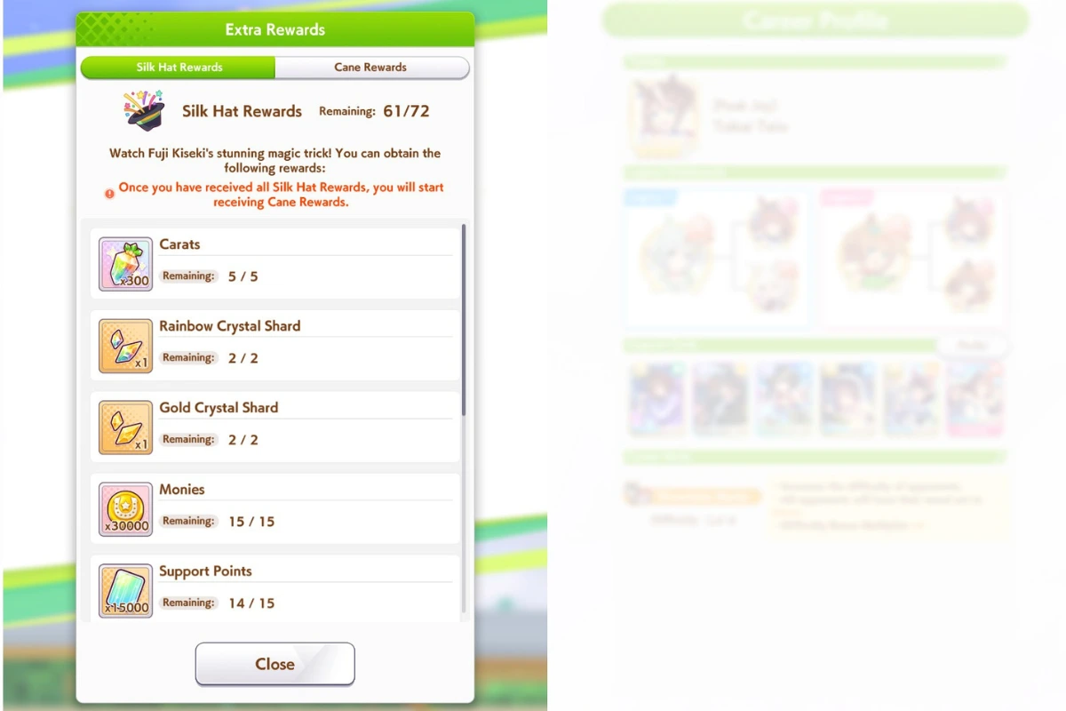 Filling the reward gauge allows you to get a random item from the Silk Hat list. There are a total of 72 fixed Silk Hat rewards. Once you’ve obtained all the Silk Hat rewards, you’ll get a random minor reward from the Cane reward list.