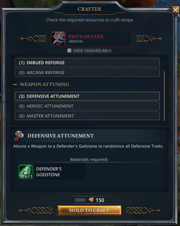 - Defensive Attunement: Rerolls Defensive traits for 1 Defender’s Godstone and 150 Gold