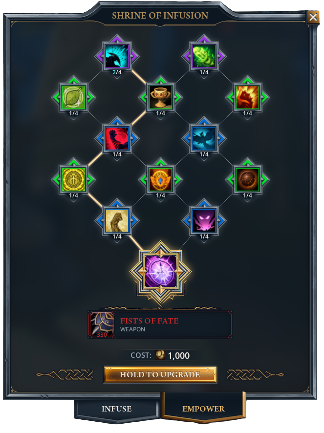 One of the biggest power jumps and build defining features in Fellowship are weapon infusion trees. Starting at Champion difficulty, you can get weapons that drop with infusion trees which give powerful passive buffs to your hero.