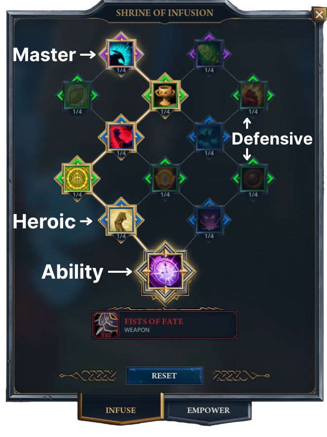 Each tree is randomly generated with a set of Defensive, Heroic, and Master traits. These traits can also be re-rolled and later enhanced to create your perfect weapon for your build. To inspect the traits, head to the Shrine of Infusion.