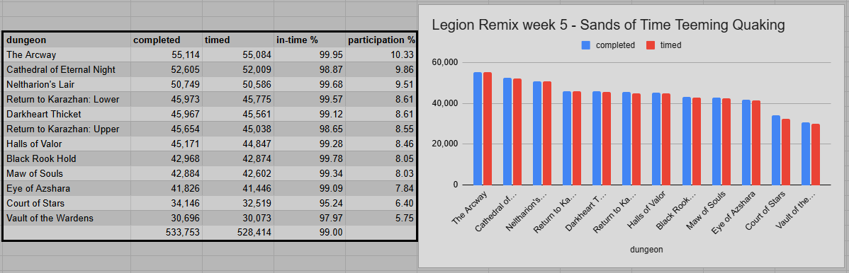 The overall spread hasn’t changed much. Cathedral, despite being disliked in the original Legion seasons, proved to be a rather popular and quick dungeon. Arcway remained the most popular farm dungeon with Cathedral and Neltharion’s Lair behind. The others barely changed. Court of Stars and Vault of the Wardens cement their role as reminders for less RP and travel in M+.