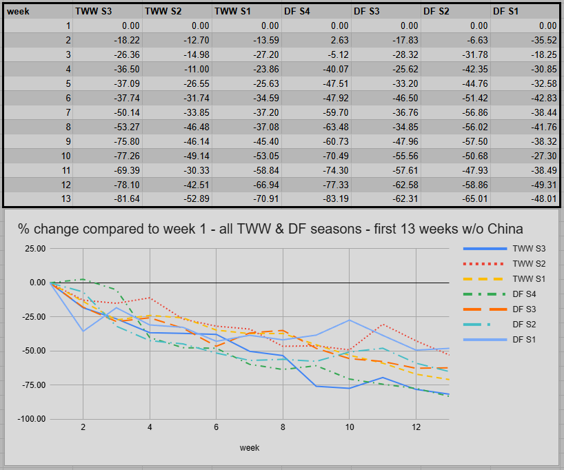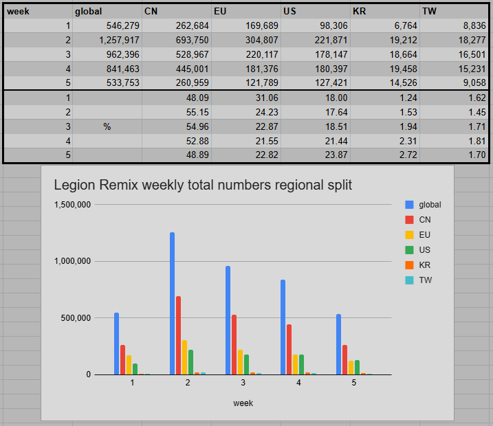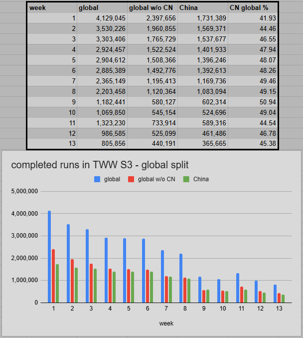 Compared to last week, we see a drop-off of 18.32% globally. With 16.17% in the four regular regions, we get close to the regular long-term decline of other seasons. On the Chinese servers, the numbers fell by 20.76%. This downward trend has been consistent across previous seasons. And for now, TWW S3 is on track with DF S4’s pattern. Both times, Retail faced competition from Remix. But once Remix has all of its content unlocked in week 15, we might see an even larger shift back toward Retail, since you can transfer Remix characters at any time.
