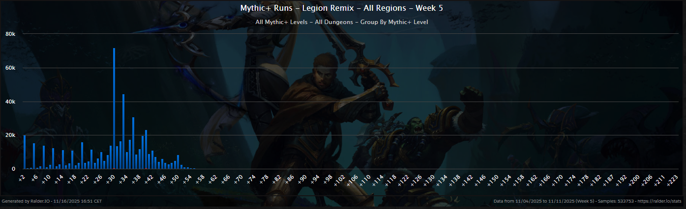 The thirteenth week of Mythic+ in this season is over, and Nightstalker314 is taking a look at the weekly data provided by Raider.IO . Overall activity in Retail dropped by 18.32%. In Remix, the drop was much steeper at 36.57%. In both cases, Chinese servers saw a more pronounced decline. Players are increasingly less focused on regular rewards and progression. Capstone achievements and cosmetics are the remaining draw for M+ players. So let’s look at the details.