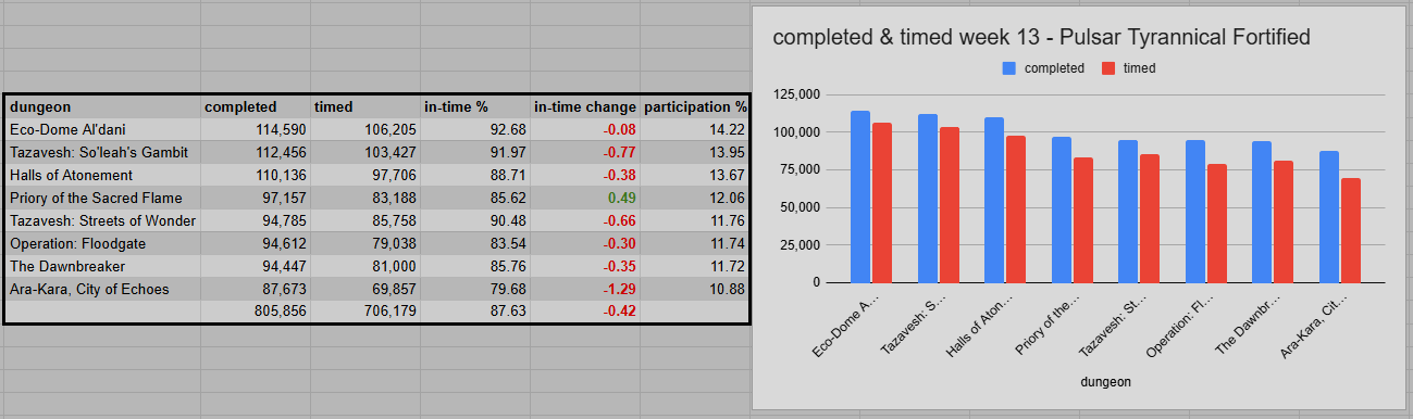 Eco-Dome (92.68%) was once again leading with a decent gap. Gambit (91.97%), Streets of Wonder (90.48%), and Halls (88.71%) followed as usual. The Dawnbreaker (85.76%) was just ahead of Priory (85.62%). The latter usually sees a better rate when Tyrannical is the first affix from level 7 to 9. Floodgate (83.54%) was comfortably above 80% while Ara-Kara (79.68%) once again dropped below this threshold. The Pulsar affix is especially punishing in high-mobility encounters.