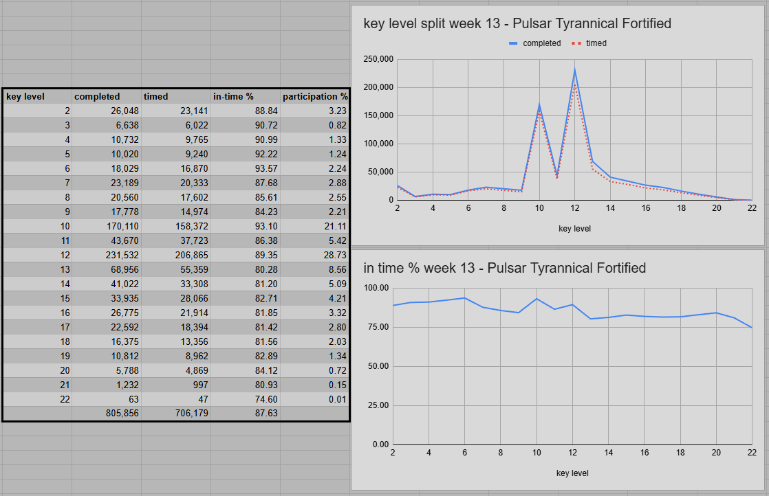 83.50% of all keys were completed at key level 10 or higher. 21.11% on key level 10 alone. But key level 12 was still the main draw this week. With 28.73% of all keys at level 12 and 56.97% in level 12 and above, the focus remains on high-level keys. High-end progression has slowed down noticeably. Total run numbers were still increasing for levels 20 to 22, but the rate is decreasing week by week. In the MDI, we have seen new records set at +23 and +24. But so far, players have not timed them on the live servers. The season has around 10 weeks left.