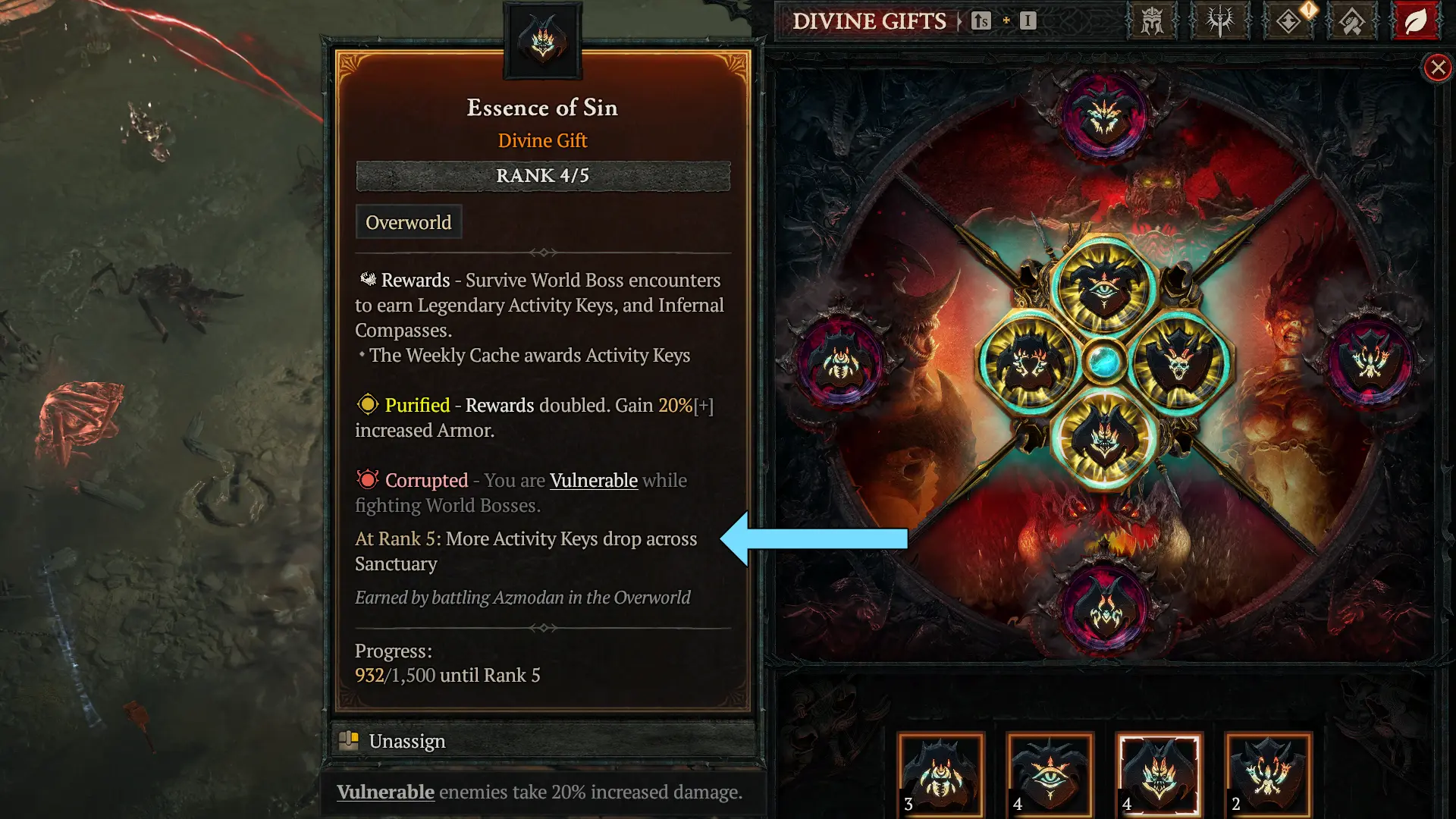 Leveling Essence of Sin to Rank 4, or ideally Rank 5, is not just about completion. Higher ranks increase drop chances for several valuable items, including Nightmare Dungeon keys, Tributes of Ascendance, and extremely rare Mythic Prankster sigils. That alone makes it one of the more important Divine Gifts this season.