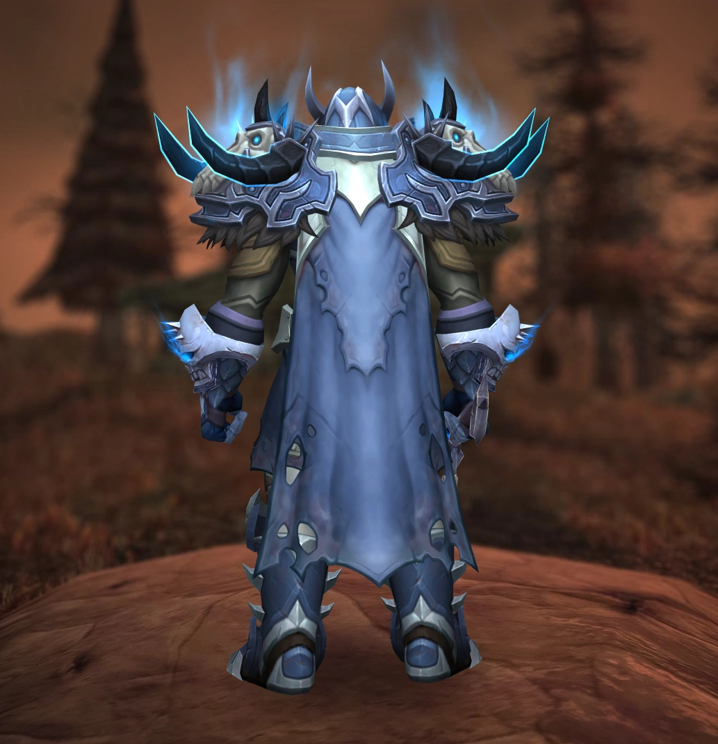 Now that the Voidstorm questline bug is fixed, you can finally complete it to unlock the blue transmog sets for each class. This set uses a faded sky blue palette and carries consistent upward-curved geometric motif across the helmet, chest, shoulders, and boots.
