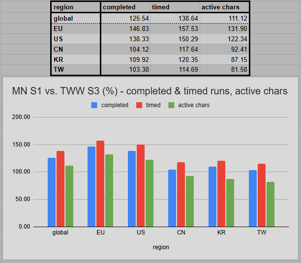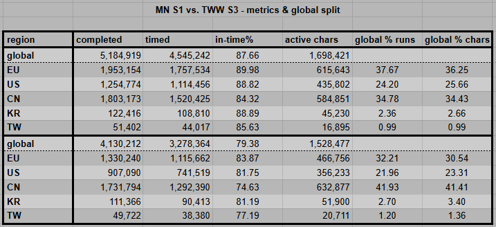 The most important metric already shows a remaining trend. 25.54% more completed runs across all regions. 38.64% more timed runs are also reflected by a much higher completion rate. 87.66% instead of 79.38%. The total run numbers are still ahead of the previous season for every season. But the number of active characters is 7.6% to 18.5% behind on Asian servers.