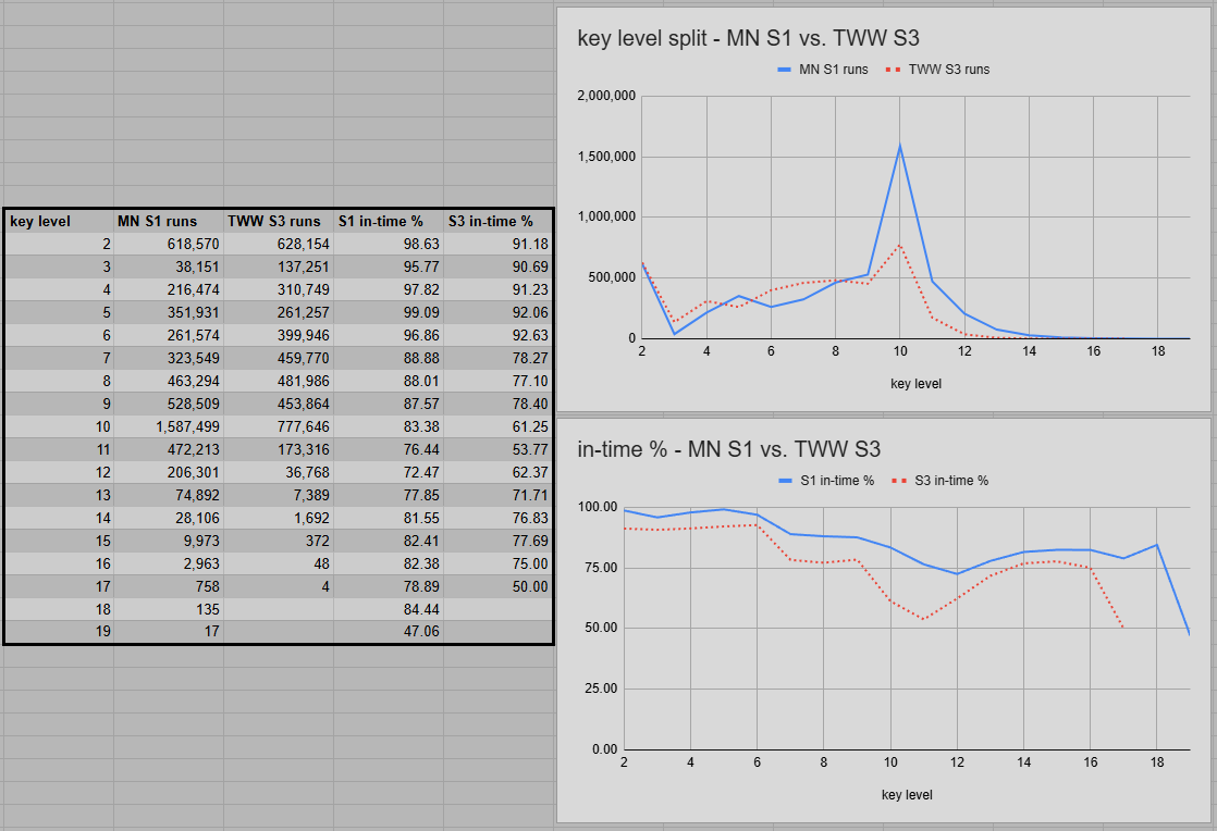 Since TWW S3 and MN S1 have access to the full global data, an overall key level comparison is rather accurate. Both graphs, for complete runs and in-time percentage, look more like a comparison between the first week of a season and the second or third. Players were quite happy about checking off a +10 in the first week in TWW S3. In MN S1, many have already filled their entire vault with +10s.