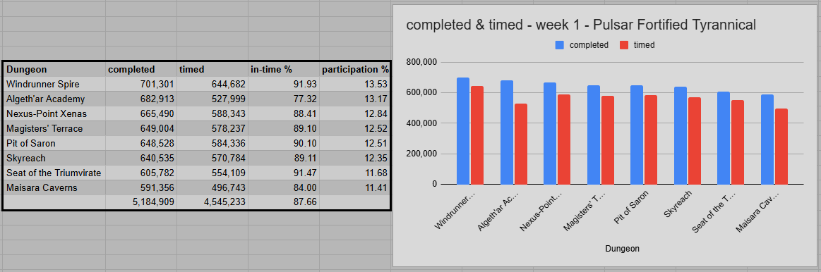 An overall in-time percentage of 87.66% is unheard of for the first week of a season or even of an expansion. Windrunner’s Spire (91.93%) and Seat (91.47%) kept their top positions from the first 24 hours of the week. Pit of Saron (90.10%) is doing really well for a reworked version of a 16-year-old dungeon. Skyreach (89.11%) and Magister’s Terrace (89.10%) are also quite forgiving. And Nexus-Point Xenas (88.41%) is also not too far from the top.