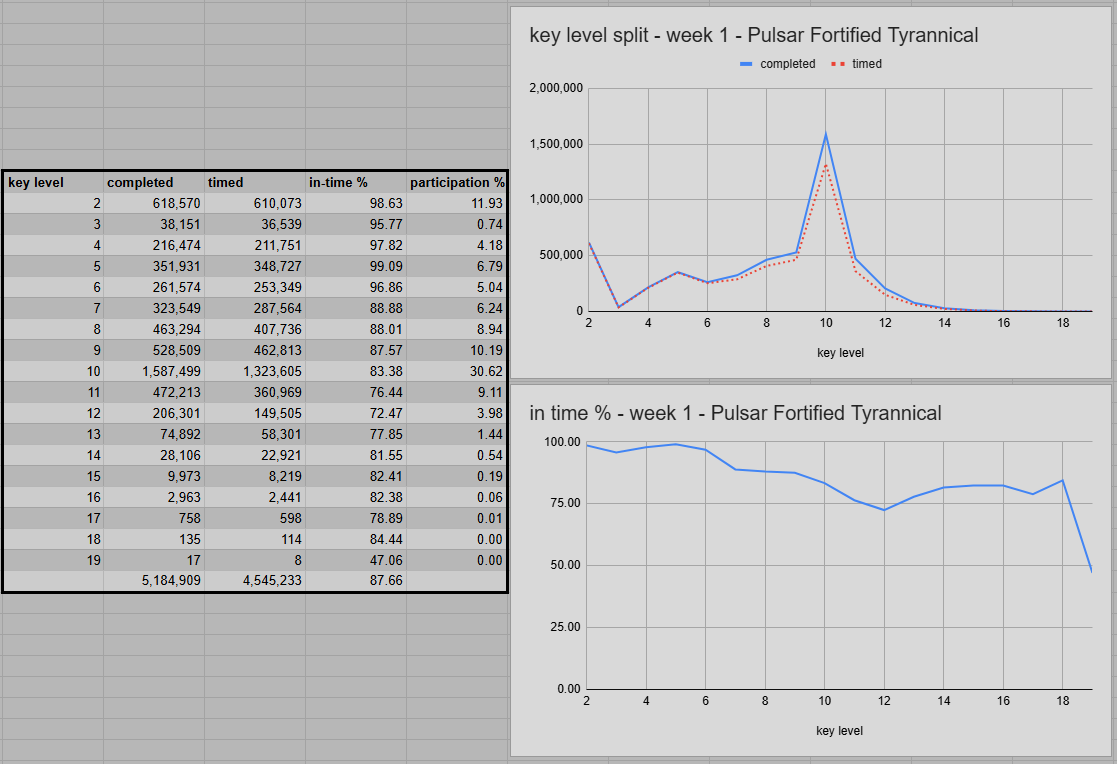 The overall success rate of 87.66% is also quite ahead of TWW S3 (82.80%) and TWW S1 (78.23%). 83.38% of all level 10 keys were timed. This value was at just 61.25% in TWW S3. And restricted to the four regular regions at a measly 36.14% in TWW S1. We are experiencing a never-before-seen level of tuning for the start of an expansion. One thing remains, though, the jump in difficulty at key levels 7 and 10. The success rate drops by almost 8 percentage points from 6 to 7 and by 4.19 points from 9 to 10. For the latter, this will flip once +10s are on farm status.