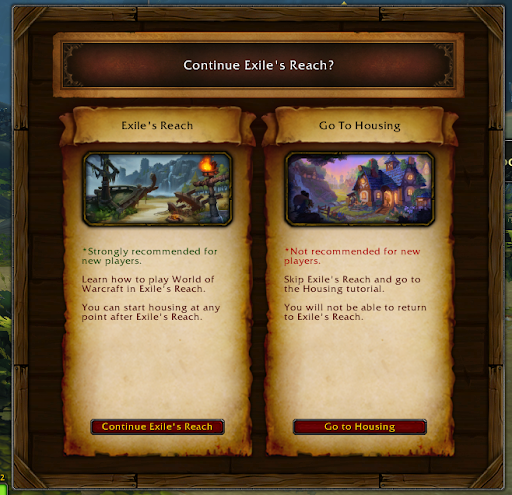 You’re given a choice to continue with Exile’s reach, the recommended option for new players, or go directly to housing.