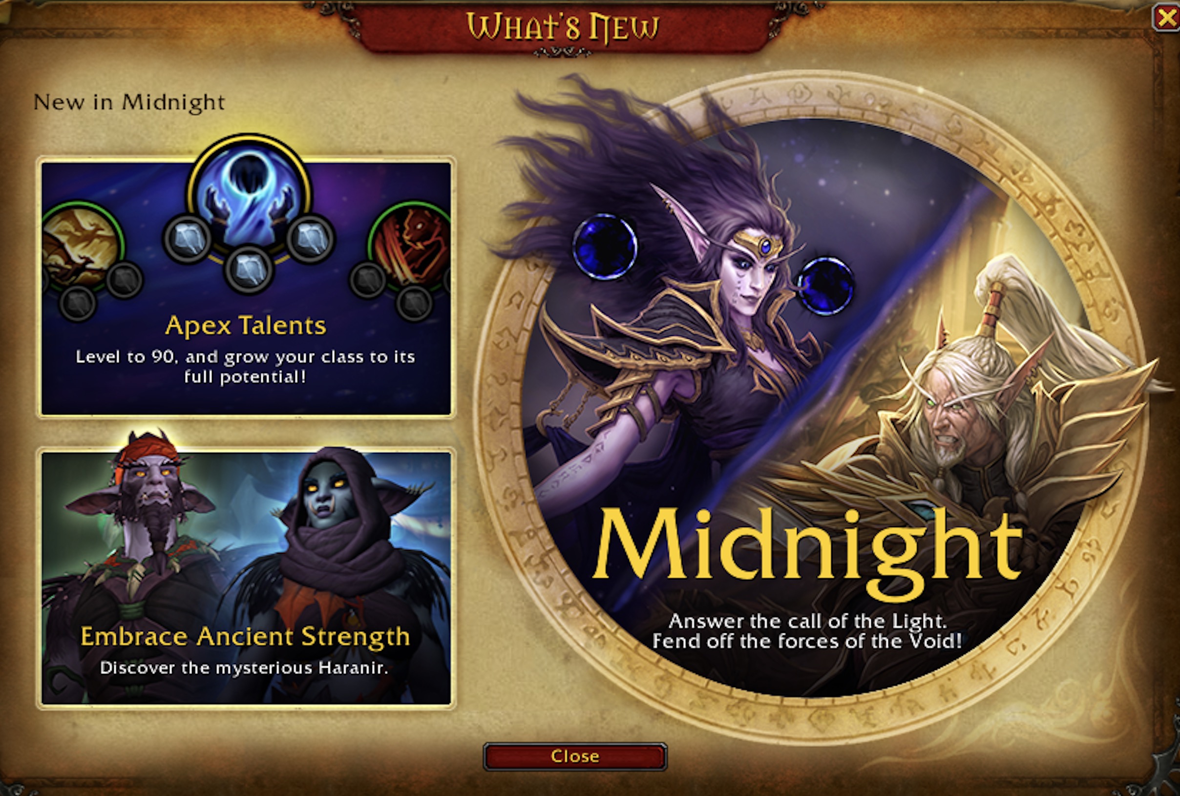 The Midnight splash screen will be available starting February 27, 2026 when early access begins. It shows the features available at launch, including the new story, leveling your char to 90, and the Haranir Allied Race.